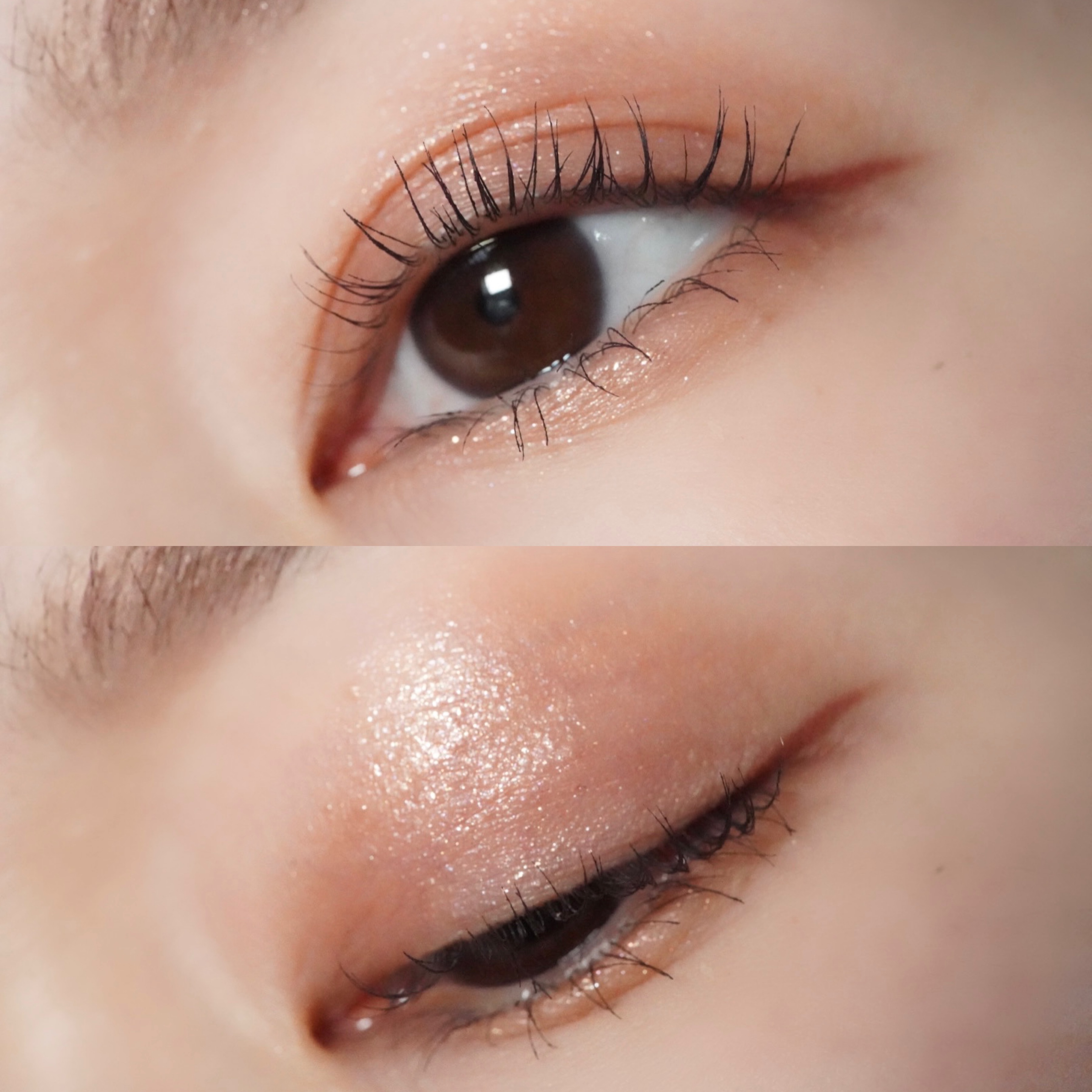 よくパレットのなかで明るいカラーをベースにまぶたに広く塗ることが多いのですが、パール感のあるカラーを避ける🙆♀️! パール感たっぷりの明るいカラーは涙袋に使うぐらい光を集めてぷっくり見せてくれるので、まぶたに広く使うと腫れぼったく見えがち😓 目元を明るくみせてくれたり、次に使うアイシャドウをぼかしやすくしてくれるけど、すっ飛ばしてメインのカラーを塗っちゃう✊🏻❤️🔥 涙袋にはたっぷり塗ってぷっくり見せる🙆♀️💕 シルキースフレアイズのマットタイプはすごく優れているな〜と感じました☺️💗 赤やオレンジなどは、入れすぎると腫れぼったく見えやすいので、見せたいカラーは下まぶた目尻にのせて色をたのしむ♡♡ パール感なしの透けマットだけじゃ物足りない… そう感じさせない華やかなラメが左上に入っているので黒目上と涙袋にのせるとすごく可愛い仕上がりに😍! 厄介な左右差のお陰でマットアイシャドウが好きになりました😌💕