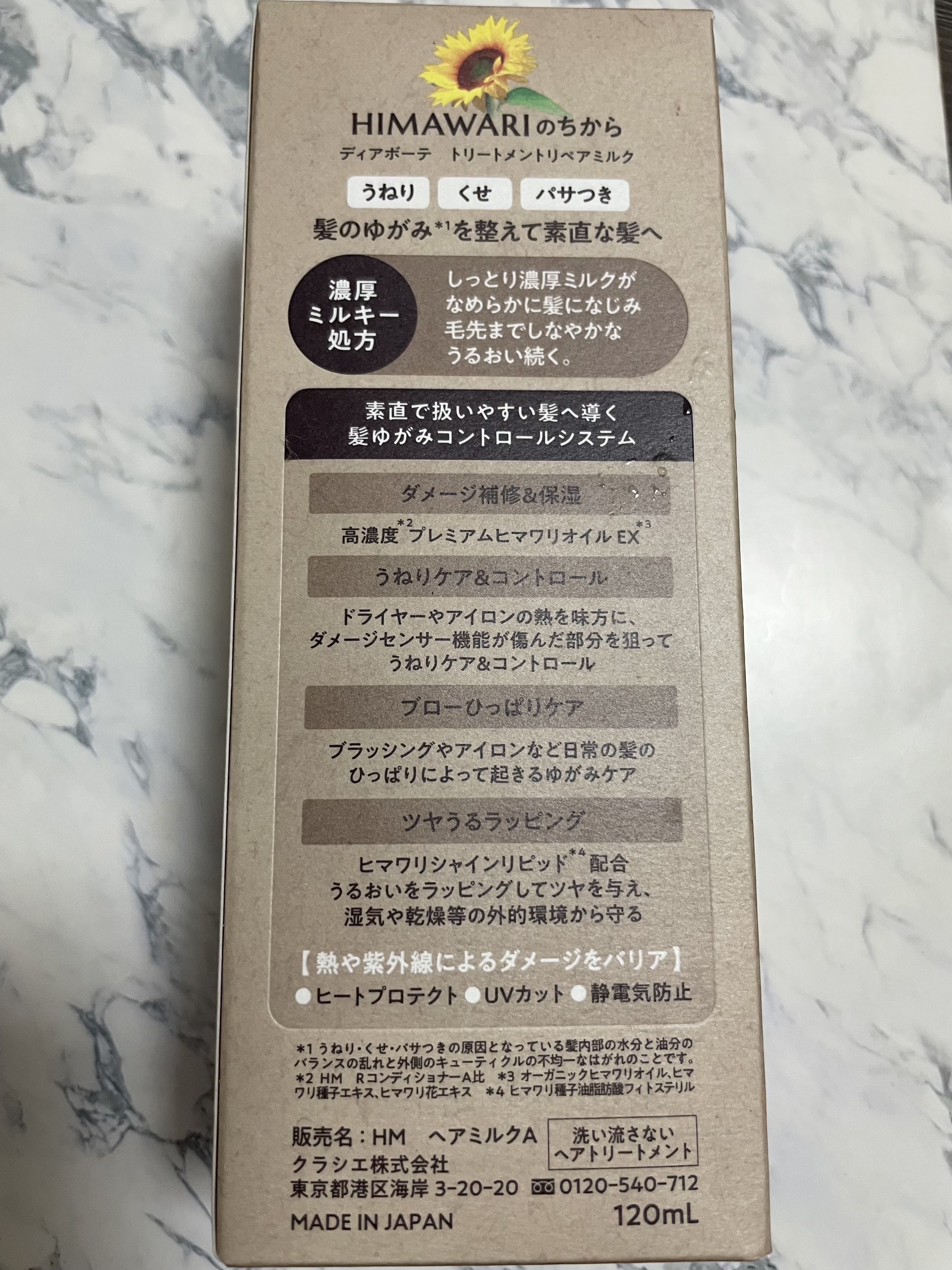 - ※2024年9月30日、リニューアル。 ●髪のゆがみ*1をケアして、素直な髪へ導くヘアケアブランド ●毛先までしなやかなうるおい続くミルクタイプの洗い流さないトリートメント ●濃厚ミルキー処方 ●素直で扱いやすい髪へ導くゆがみ*1ケアシステム ●ダメージ補修&保湿成分「高濃度*2プレミアムヒマワリオイルEX*3」配合 ●熱を味方に毛髪と結合し、髪の外側をコート ●浸透サポート成分(セバシン酸ジエチル)配合で、成分を髪内部に素早く浸透 ●ブローひっぱりケア ●「ヒマワリシャインリピッド*4」を配合した「ツヤうるラッピング」 ●ヒートプロテクト ●UVカット ●静電気防止 ●陽だまりのあたたかさと透き通ってさわやかなエレガントフローラルの香り *1:うねり・くせ・パサつきの原因となっている髪内部の水分と油分のバランスの乱れと外側のキューティクルの不均一なはがれのこと *2:HM RコンディショナーA比 *3:オーガニックヒマワリオイル、ヒマワリ種子エキス、ヒマワリ花エキス *4:ヒマワリ種子油脂肪酸フィトステリル(うるおい成分)