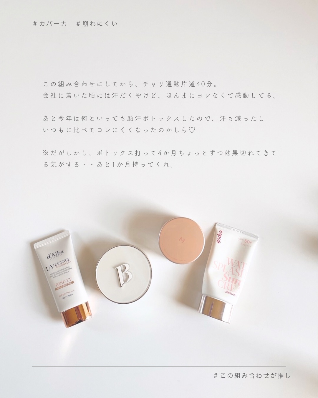 今年はボトックスをTゾーンあたりに打ったこともあって汗の量も減ってがっつりメイクよれもなかったんやけど、でも小鼻の横はどーしてもハゲててさ🫠 この組み合わせが最強すぎた🤗❤️ 小鼻の横はちょっとヨレるけど半日汗だくなって帰宅してもヨレとらんのよ🫶🏻 ̖́- MISSHAのフェイスパウダーまじでお気に入り(🫶🏻' ')❤️ 今まで、パウダー後小梅太夫かよ。ってなってたけどMISSHAは元々肌色のパウダーやからか白くなりすぎんのよ☝️
