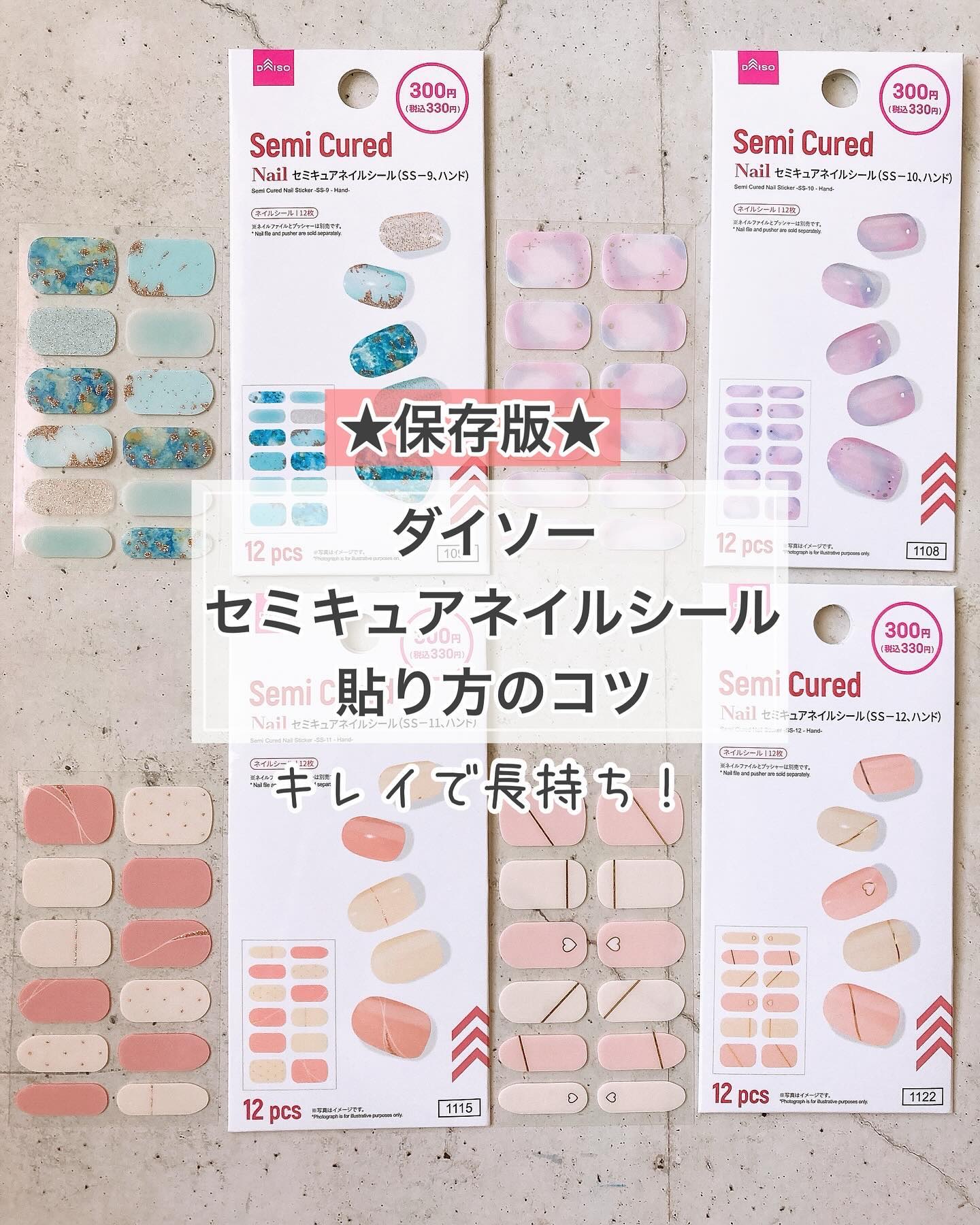 ずっと気になっていたDAISOのジェルネイルシールを使ってみた😊種類がたくさんあって、まず選ぶ楽しみがある🥹!!!可愛いデザインが沢山💓硬化タイプなので貼ってから、自前のライトで硬化しました✨(60秒)GelMeシリーズとかに比べると、やっぱ...