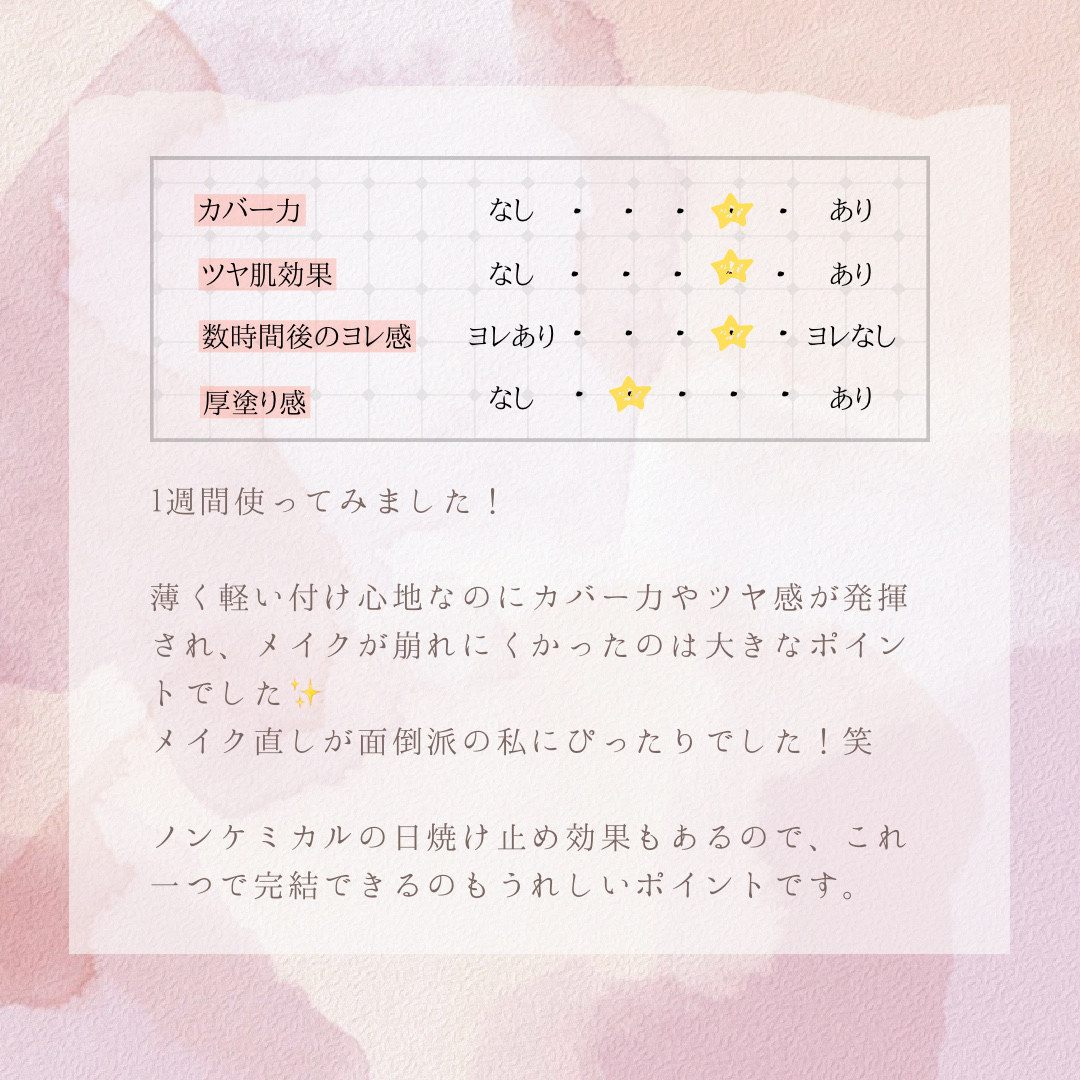 固めのテクスチャですが広げるとスーッと伸びて少量でも広範囲をカバーしてくれます✨️ 出した瞬間の色味は結構暗めですが広げるうちに明るくなって少しトーンアップします🥰 香りは無臭ではなく結構しっかりめにアリ メイク用品の匂いは特に好みが分かれると思うのですが私は好きな香りでした! 塗った直後の肌の様子はザラザラからサラサラに✨️ マスクをしててもヨレはいつもより抑えられてるので仕事でマスクを外せない日などに重宝しそうです✨️