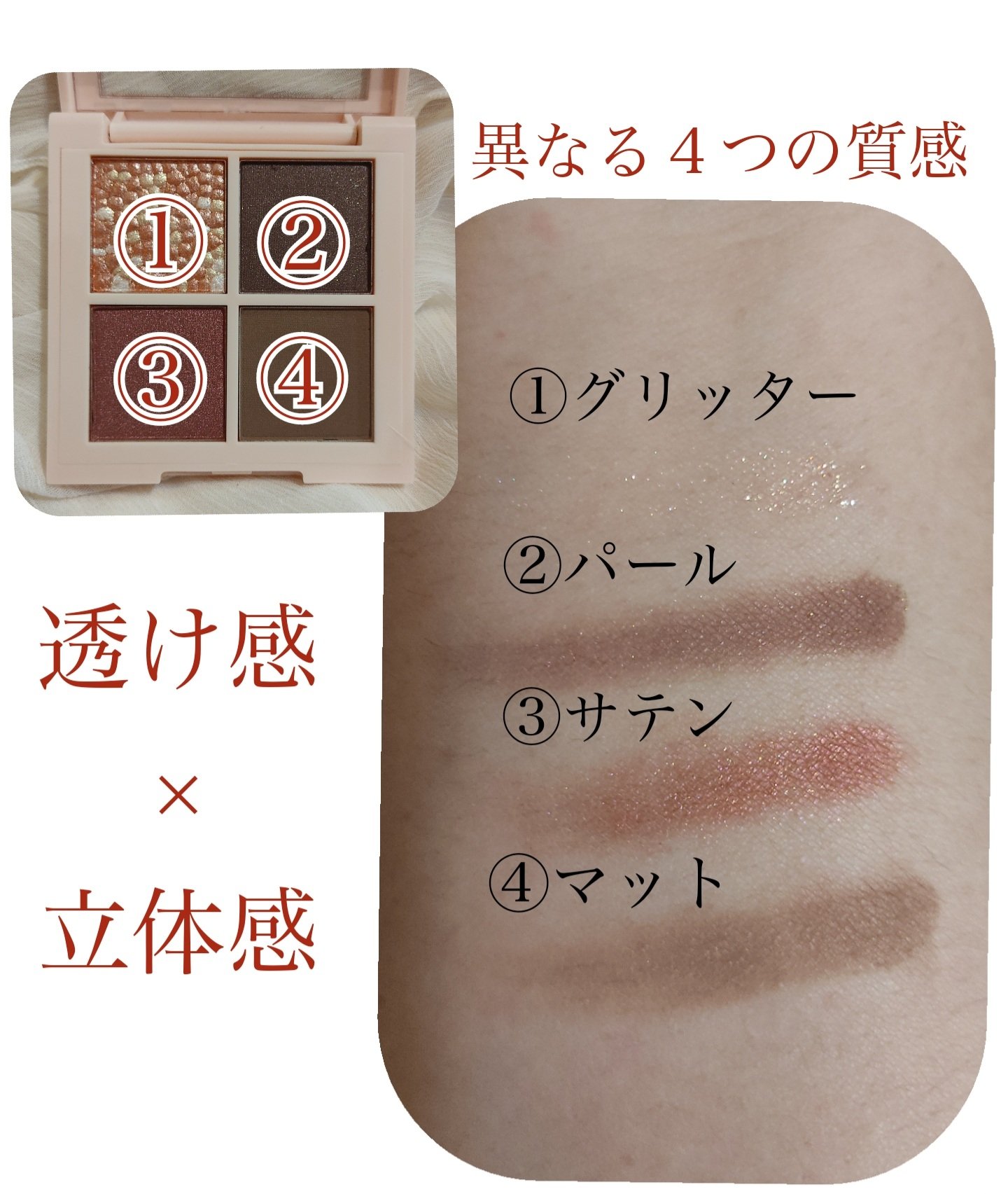 - 透け感カラーに、キラめきレイヤードをプラス #質感ミックス アイシャドウ 1. 4つの異なる質感をミックス マット・サテン・パール・グリッター、4つの質感が楽しめるマルチパレット 2.透け感そのまま!キラめきのレイヤード 重ねても、キレイにキラめく透け感カラーで、澄んだ奥行きのある目元に 3.ふわっとエアリー、なのに高密着 キメの細かな微粒子パウダーがふわっとフィット。軽いのに、しっかり密着 ■001 グレイジング ブラウン 肌にとけ込むシックなグラデ ニュアンス ベージュ ■002 サンセット ブリック マットとキラメキで旬顔! スモーキー テラコッタ ■003 ヴィンテージ ローズ 甘さおさえめでオトナっぽい ボルドー ピンク ■004 ロージー ブラウン 上品に盛れる! ローズ ブラウン ■005 ダスティ モーヴ 繊細なニュアンスを秘めた グレージュモーブ ■006 サファリ シマー 印象深いまなざしの カーキグリーン ■007 ジュエル ムーン ほんのり甘めのキラめき プラムピンク ■008 カシミア ヌード 上質なカシミアを纏ったような ウォームベージュ ■013 ローズ ラスター クールなまなざし グレイッシュローズ ■015 コズミック スター 幻想的な煌めき ブロンズピンク