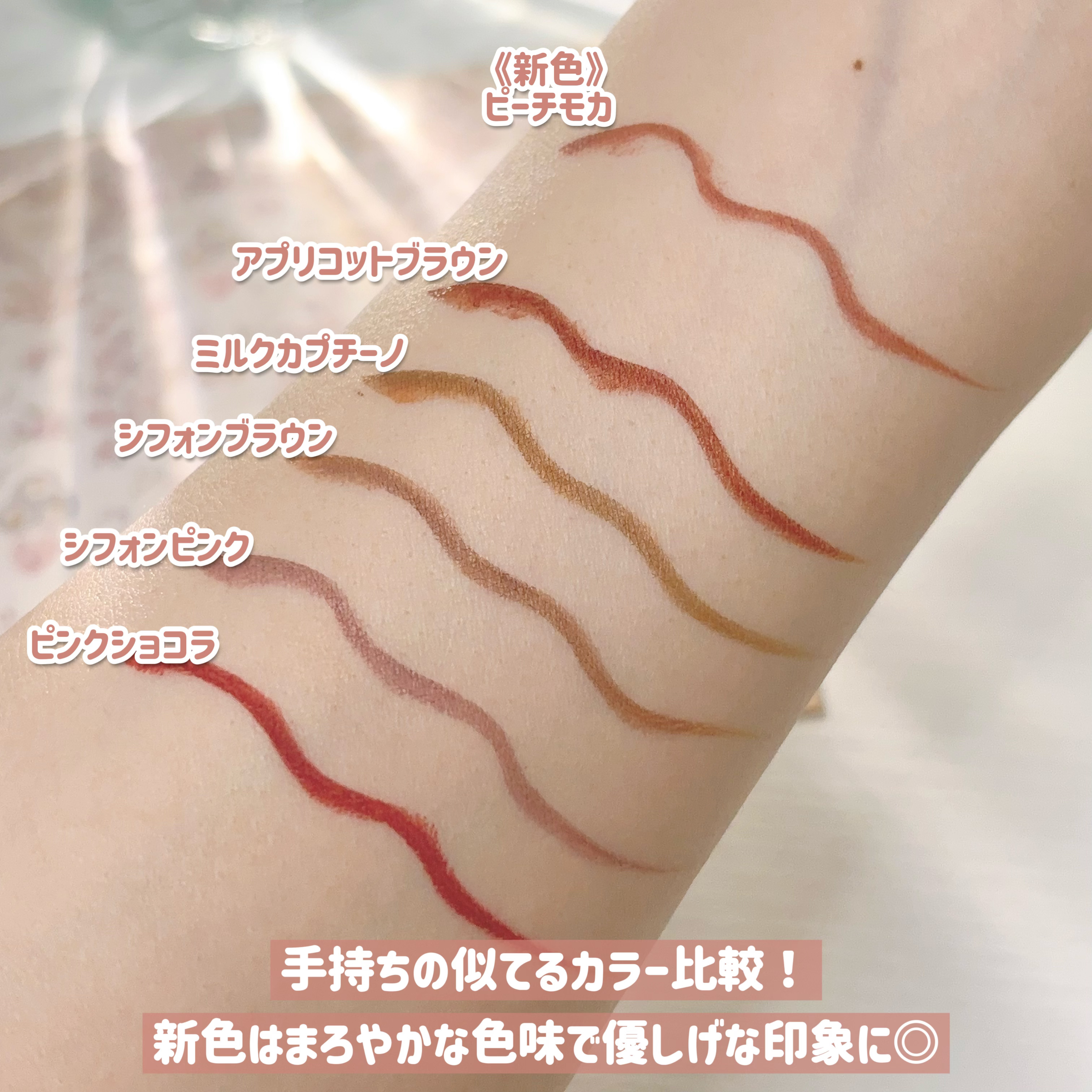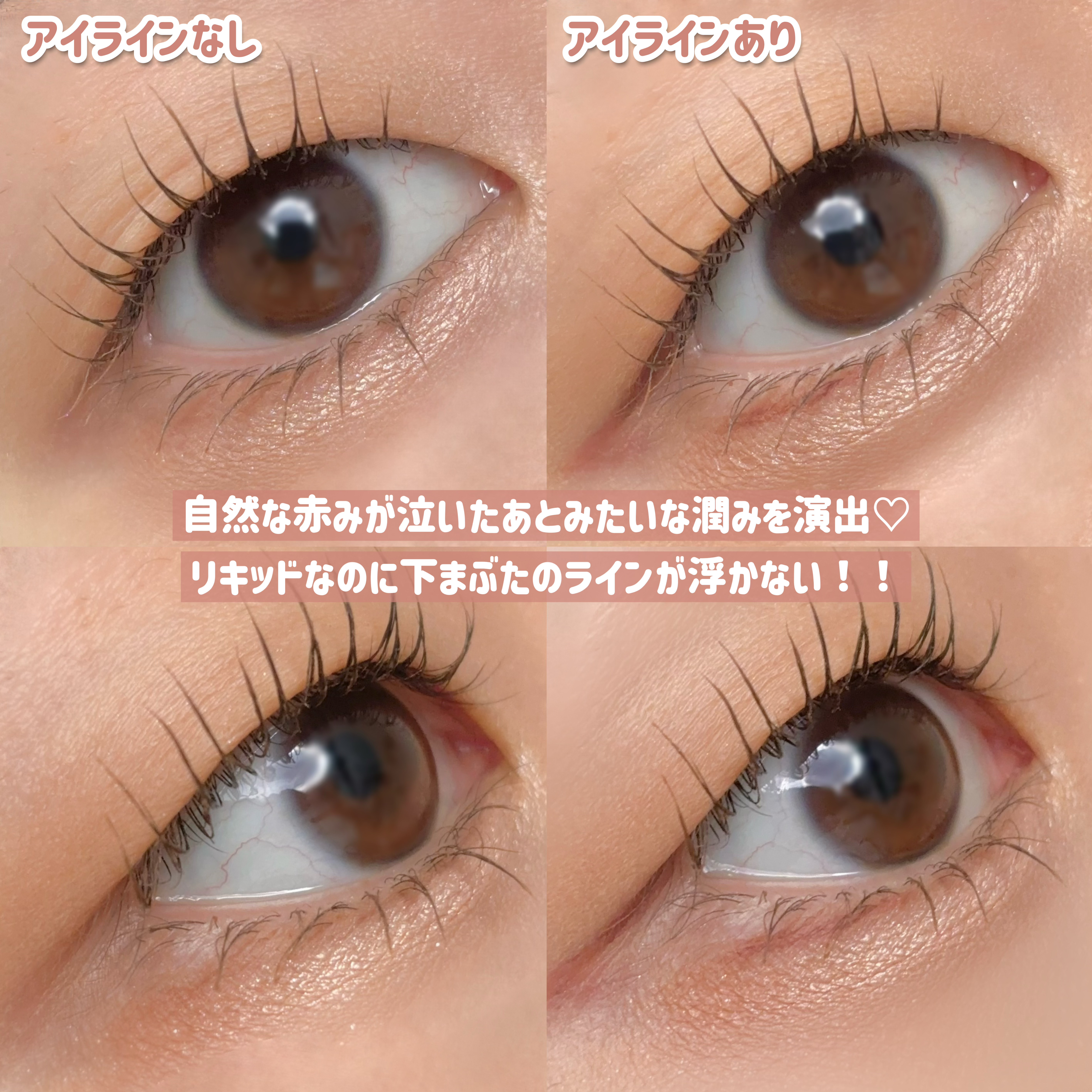 - 筆先までずっとなめらか、目尻で感動するリキッドアイライナー。 必要な量が肌にのる新設計で、まぶたの上をすべるような、滑らかな描き心地。しなやかでコシのある筆が、筆圧のコントロールを容易にし、太いラインも細いラインも思い通りに仕上げます。水、汗、涙に強いウォータープルーフタイプなのに、通常洗顔で簡単オフ。肌に色素が残らない顔料を使用。5種類の美容液成分を従来品の200%配合し、メイクしながら目元ケアまで。 ●ブラウンブラック ※2020年9月12日 バラエティショップ先行発売 ●漆黒ブラック ※2020年12月頃発売予定 ●ナチュラルブラウン ※2020年12月頃発売予定 ●シフォンブラウン 「毎日メイクに透明感と抜け感」 ブラウンでも、グレーでも、ベージュでもないニュアンスカラー。 自然な印影で素の目元を際立て、頑張りすぎない、ふんわりとした目元に。 ●アプリコットブラウン 「じゅわっと血色感。 肌に馴染むおしゃれカラー」 温かみのあるアプリコットがじゅわっと滲む血色感を目元に演出。 肌馴染みが良いので、カラーライナーに抵抗がある方もブラウンの延長線上で楽しめる、使いやすい色味です。 ”ちょっとオシャレ”な空気感を演出するカラー。 ●ピンクショコラ アイライナー 「ピンクが溶け込む濃厚ブラウン」 肌馴染みが良く、目元にじんわり血色感をプラス。 さりげなく女性らしさが加速するようなカラー。 ●ピスタチオラテ (2022年7月29日(金)発売) 「“目尻”に抜け感アクセント」 肌に馴染むのに映える絶妙なグリーン。 トレンドカラーに“くすみ”と“抜け感”をプラスしたまろやかな発色。 ●マスタードブラウン 「“イエロー”が揺れる、大人の洒落色」 (2022年7月29日(金)発売) まるで太陽のような暖かさを感じる新しいブラウン。 ほんのり感じるイエローでメイクが一気に垢抜ける稀有な色。 ●シフォンピンク(2023年2月10日発売) 「ふんわり柔らか"まろみピンク"」 甘くなりすぎない青みニュアンスで目元の透明感UP。 目元を引き締め、ピンクメイクにありがちな腫れぼったさを解消。 ●ミルクカプチーノ(2023年4月21日発売) まろやかな深みの“優しい締め色” どんなメイクにも合わせやすいカラー。 自然な陰影でさりげなく目幅を拡張します。 ●グレーカシミア(2023年10月1日発売) ブラウンがほんのり溶け込んだ、暖色グレー まろやかな発色で、パーソナルカラーを問わず肌に馴染む 目元の陰影になりすまし、抜け感と目力を欲張りに叶える ●ダークフィグ(2024年6月1日発売) するする”なめらか。描きやすいのに、落ちにくい。 クッキリ可愛いほの甘ダークブラウン ●ピーチモカ(2024年8月1日発売) ふわっと自然に盛れる“桃色ブラウン” ほんのり血色感で目元にうるみ感を演出 ●スターダストブラウン(2024年12月11日発売) キラッと繊細に輝く''星屑ブラウン'' 透け感のあるダークブラウンの色味とラメの輝きが、目元に艶のある立体感を演出 ●チャコールモカ(2025年4月10日発売) 目元を締める''深みグレージュ'' 黄みや赤みに偏りすぎない絶妙な色設計で、自然に目元を強調