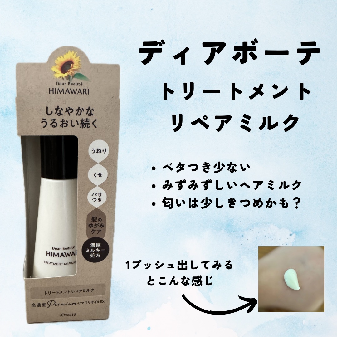 ディアボーテトリートメントリペアミルクUVカットケアもできるから朝も夜も使えて嬉しい✨テクスチャーは柔らかめなミルクでしっとりし過ぎない!乾かす前に使うとサラサラになる🥺エレガントフローラルの香りはお花感強め💐🤍LIPSを通じてディアボーテ様...
