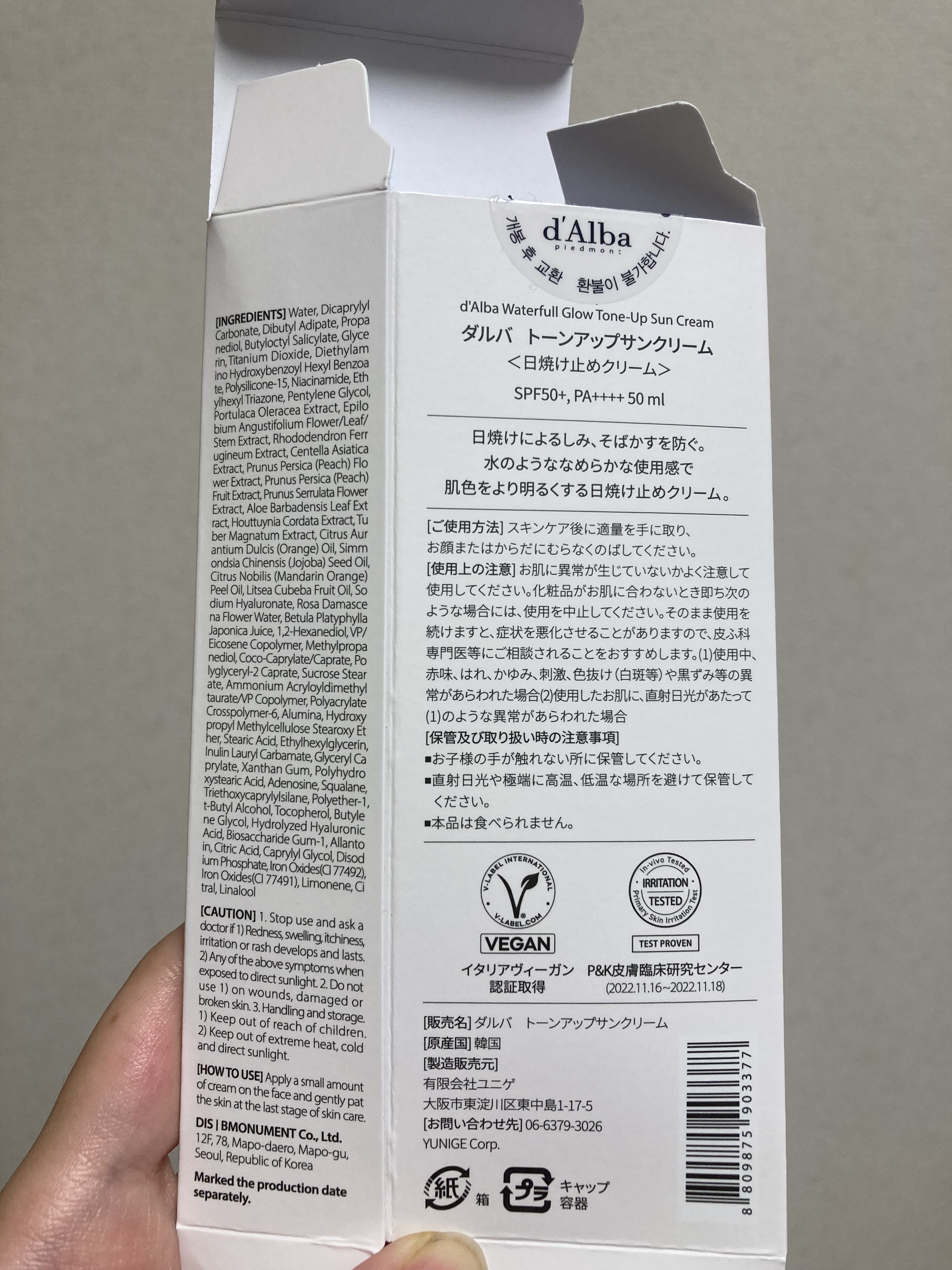 日焼けが気になる夏の下地にも🌞〜ダルバ〜ウォータフルトーンアップサンクリームSPF50+/PA++++汗・水に強いウォータープルーフ💧ヴィーガン処方・皮膚刺激テスト済みするするっと伸びがよくてつやもちな仕上がり✨白桃カラーのトーンアップ効果(...