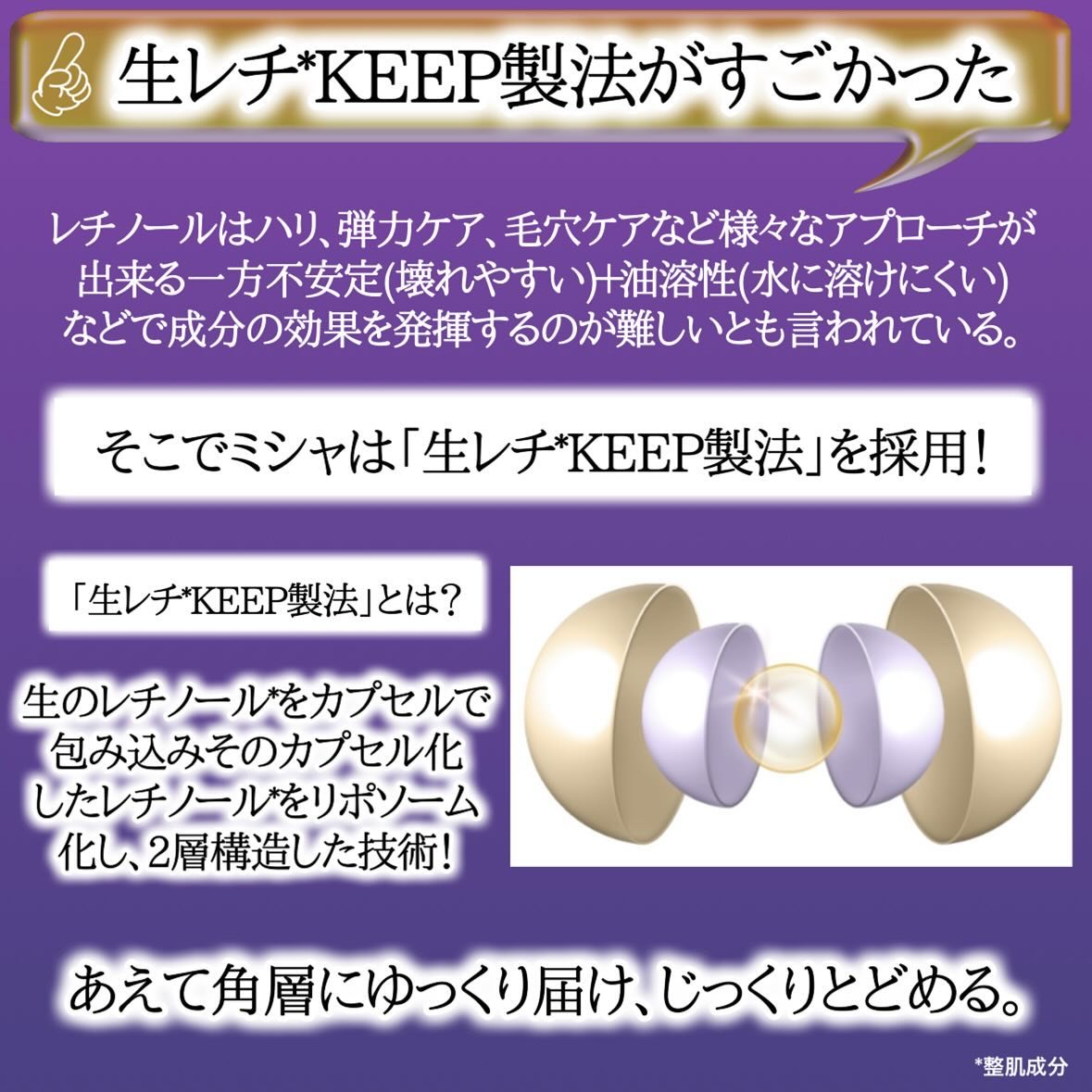 - レチノール*¹×リポソームで、ハリ・キメ整うなめらか肌へ。自分でブレンドする2 層構造のフレッシュなレチノール*¹美容液が登場! 角層への浸透の仕方が異なる2種の成 分に着目。水溶性のナイアシンアミド*²が先に届きつつ刺激を和らげ、脂溶性のレチノール*¹が後から蓋をし 、ハ リ・キメの整った 、な めらかでうるおいあふれるベビースキン*³へと導きます。さらに 、肌を水分で満たし 、光を反射したような透明感を届ける発酵成分と、角層の水分保持に効果的なセラミドNP*⁴やヒアルロン酸*⁴が 、トラブルの起こりにくい肌状態に導きます。また、フレッシュさにこだわったカチフル容器を採用。初回使用時に自分で有用成分をブレンドし、作りたてのフレッシュな生レチ*¹をご体験いただけます。 *¹ 整肌成分:レチノール *² 整肌成分 *³ うるおいで透明感のある肌印象のこと *⁴ 保湿成分