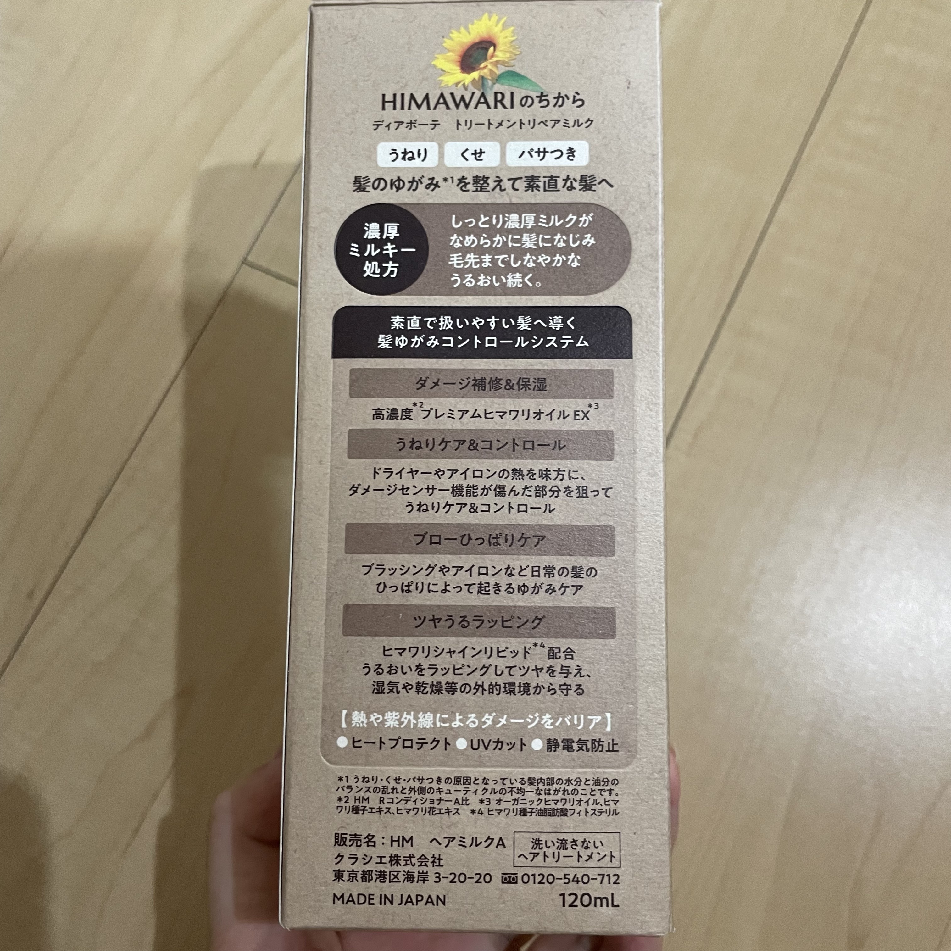 - ※2024年9月30日、リニューアル。 ●髪のゆがみ*1をケアして、素直な髪へ導くヘアケアブランド ●毛先までしなやかなうるおい続くミルクタイプの洗い流さないトリートメント ●濃厚ミルキー処方 ●素直で扱いやすい髪へ導くゆがみ*1ケアシステム ●ダメージ補修&保湿成分「高濃度*2プレミアムヒマワリオイルEX*3」配合 ●熱を味方に毛髪と結合し、髪の外側をコート ●浸透サポート成分(セバシン酸ジエチル)配合で、成分を髪内部に素早く浸透 ●ブローひっぱりケア ●「ヒマワリシャインリピッド*4」を配合した「ツヤうるラッピング」 ●ヒートプロテクト ●UVカット ●静電気防止 ●陽だまりのあたたかさと透き通ってさわやかなエレガントフローラルの香り *1:うねり・くせ・パサつきの原因となっている髪内部の水分と油分のバランスの乱れと外側のキューティクルの不均一なはがれのこと *2:HM RコンディショナーA比 *3:オーガニックヒマワリオイル、ヒマワリ種子エキス、ヒマワリ花エキス *4:ヒマワリ種子油脂肪酸フィトステリル(うるおい成分)