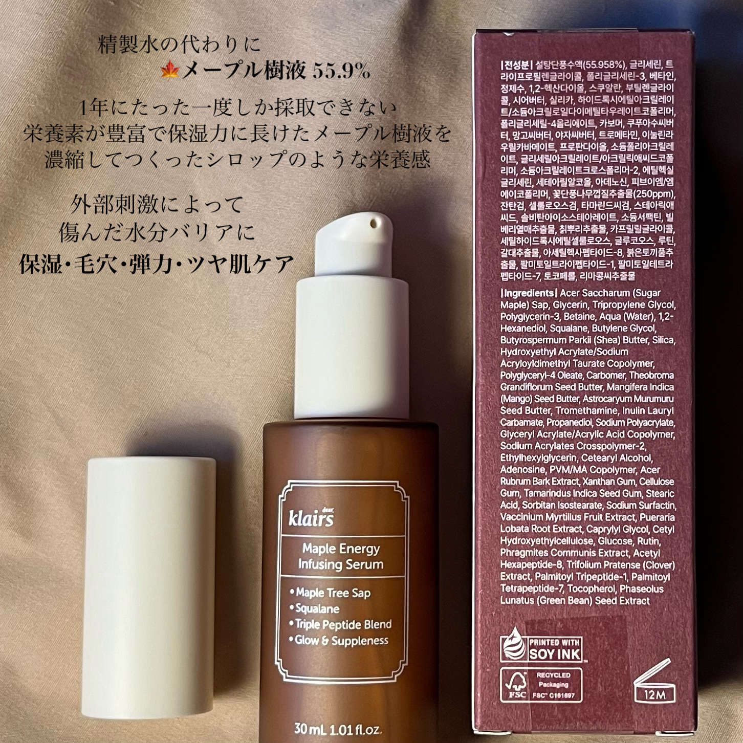 1年にたった1度しか採取できない、栄養素が豊富で保湿力に長けたメープルの樹液を使用したメープルエナジーライン🍁 精製水の代わりにメープルの樹液を55.9%含有しているセラム 水分バリアの改善が期待でき、シロップスキンが毛穴、弾力ケアや小じわケアをサポートしてくれるそう✨ なめらかなテクスチャーでしっとりするけど重くない使い心地です😉 ベタつき感があまりないので朝も使いやすく感じました✨