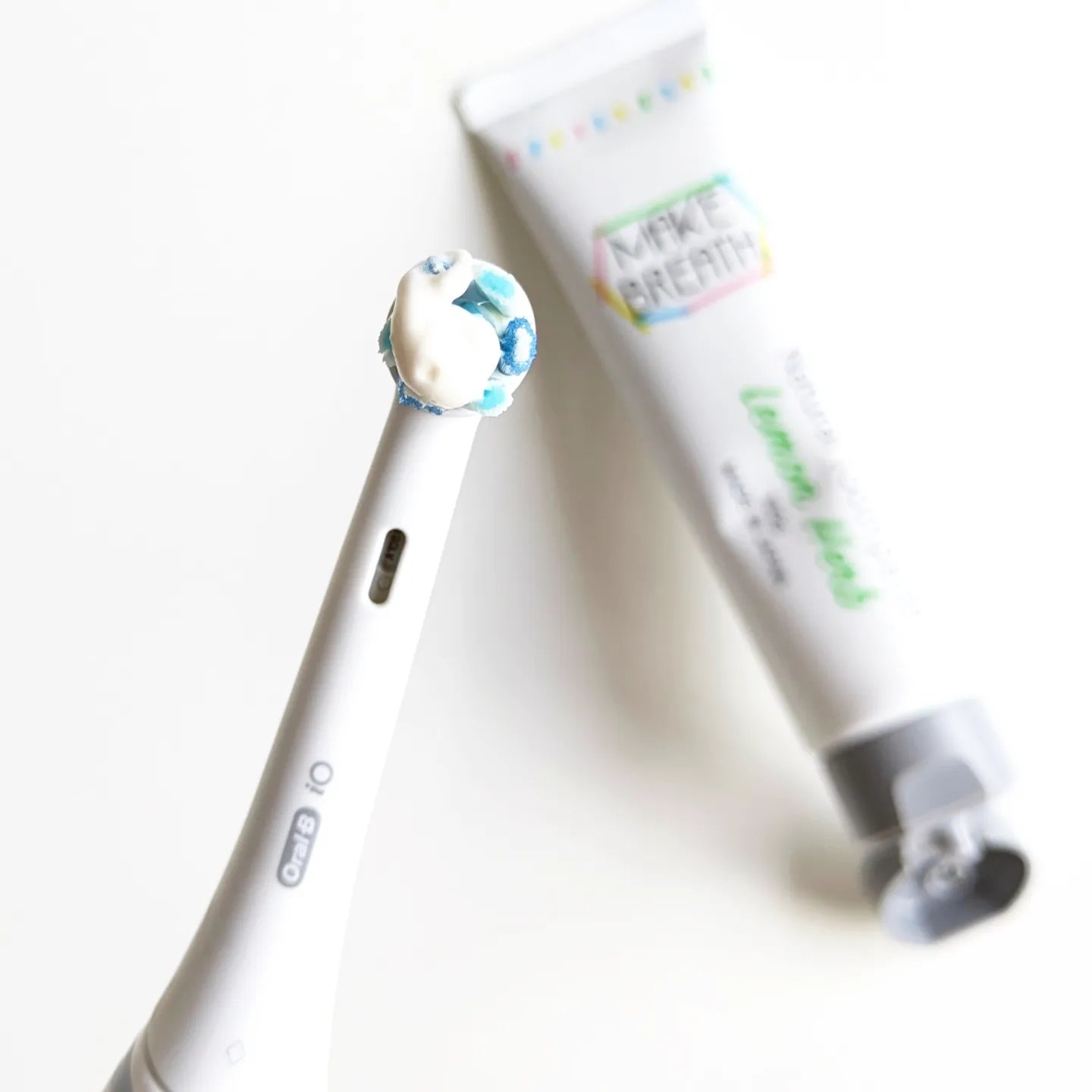メイクブレスはオーガニック認証成分を含む5種類の植物由来成分で口中が潤い、乾燥による口臭を防ぎます。 合成香料、合成甘味料を使わず植物由来成分を独自のオリジナルブレンドのスッキリ清涼感のあるレモンハーブの香り。 泡立ちも少なく、じっくり磨けます。