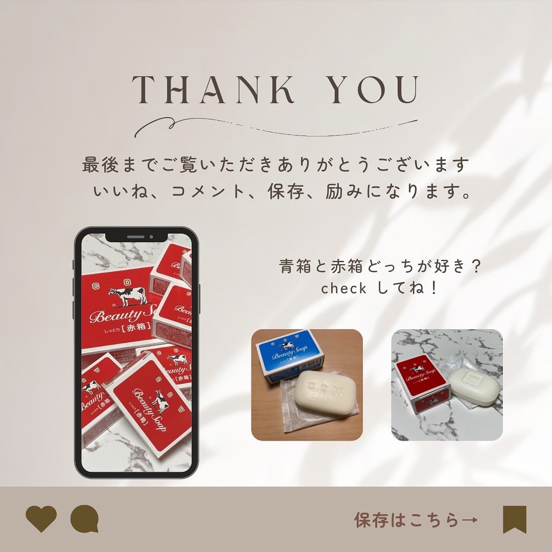 牛乳石鹸さまからいただきました.牛乳石鹸赤箱をおためししました。1928年に発売されもうすぐ100周年を迎えるロングセラーブランドの石鹸です。独自の釜だき製法で「石けん素地」から丁寧に作り上げている石鹸でうるおい成分としてスクワランとミルクバ...