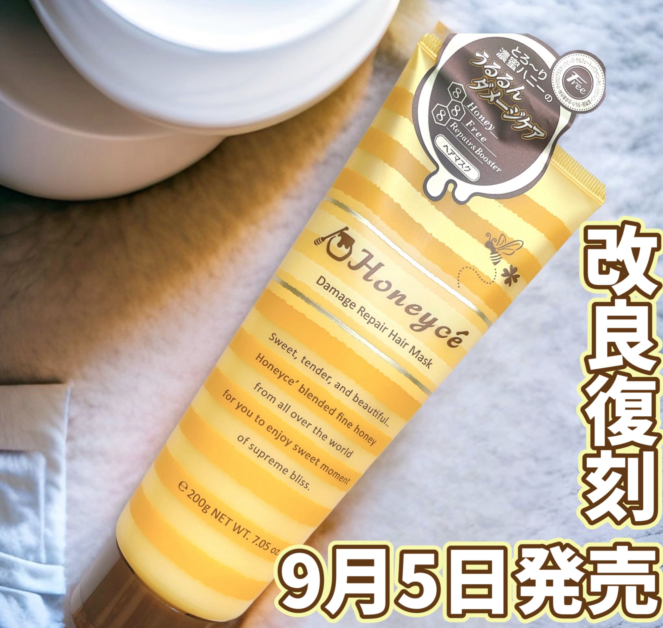 - 累計販売実績100万本*1 の大人気アイテムが改良復刻! 【とろ~り濃蜜ハニーのダメージケアマスク】 ハニーブースター処方でお手軽8秒*2 時短ケア! サロンメーカーとして蓄積した技術、そして自然との調和。 ハニーチェは毛髪科学とハチミツへの想いから生まれました。 ■こだわり&パワーアップポイント■ 【ポイント01】 『8倍*3 の濃蜜ハニー ~とろ~り潤いケア~ 』 世界中から厳選したハチミツ*4 を独自比率で配合、髪にツヤを与えうるおいでラッピングします。 【ポイント02】 『8つのリペア&ブースター成分 ~うるるんダメージケア~ 』 Wケラチン*5、アルガンオイル*6、ブースター成分*7、アミノ酸系帯電防止成分*8、 3種の天然由来保湿成分*9 配合で、髪内部に素早く浸透し、保湿&補修ケア。 【ポイント03】 『8つのフリー処方 ~ハニーチェのこだわり~ 』 サルフェート、パラベン、PG、パラフィン、鉱物油、タルク、合成着色料、マイクロプラスチックビーズ不使用。 ハニーチェが誕生以来大切にしてきた髪と肌を想うこだわりのフリー処方。 *1 2013年8月~累計出荷実績、*2 髪にもみこんでから洗い流すまでの時間の目安、*3 ハニーチェ Mへアパック Yのハチミツ総量比として、*4 ハチミツ(補修、保湿、ツヤ付与)、*5 加水分解ケラチン(羊毛)(補修)、ステアルジモニウムヒドロキシプロピル加水分解ケラチン(羊毛)(補修)、*6 アルガニアスピノサ核油(ツヤ付与)、*7 シクロヘキサン-1,4-ジカルボン酸ビスエトキシジグリコール(保湿)、*8 ココイルアルギニンエチルPCA、*9 トウミツ、酒粕エキス、グリセリン