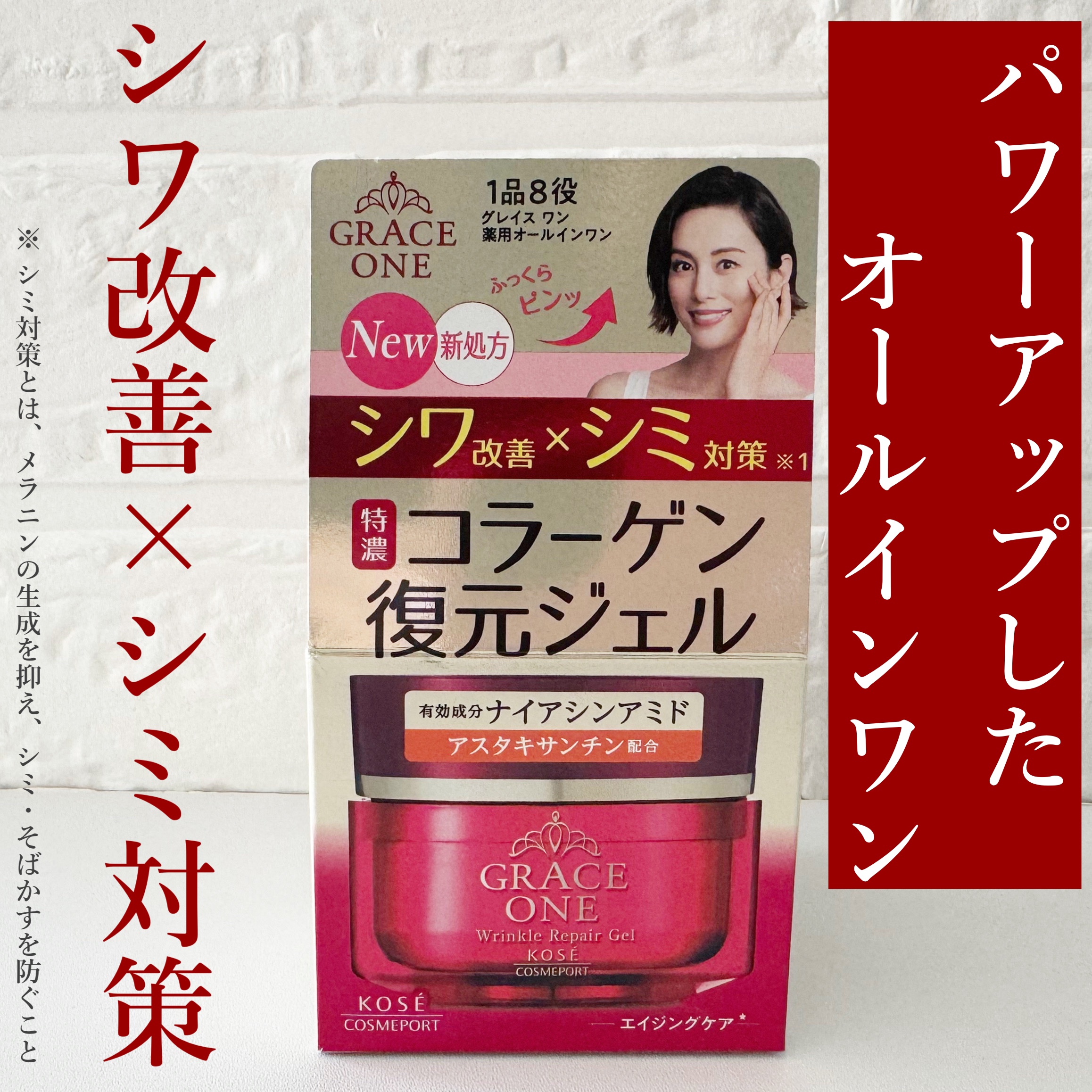 1品でシワ改善×シミ対策を叶えるという『グレイスワン』のオールインワンシリーズが、パワーアップして発売。 有効成分ナイアシンアミドを配合した医薬部外品へパワーアップされたそう。 大人の肌に贅沢なうるおいとハリツヤをあたえる濃潤処方「うるおいリフト×ハリツヤ成分」と「赤の贅沢保湿成分」を配合しているというので、魅力的に思います。