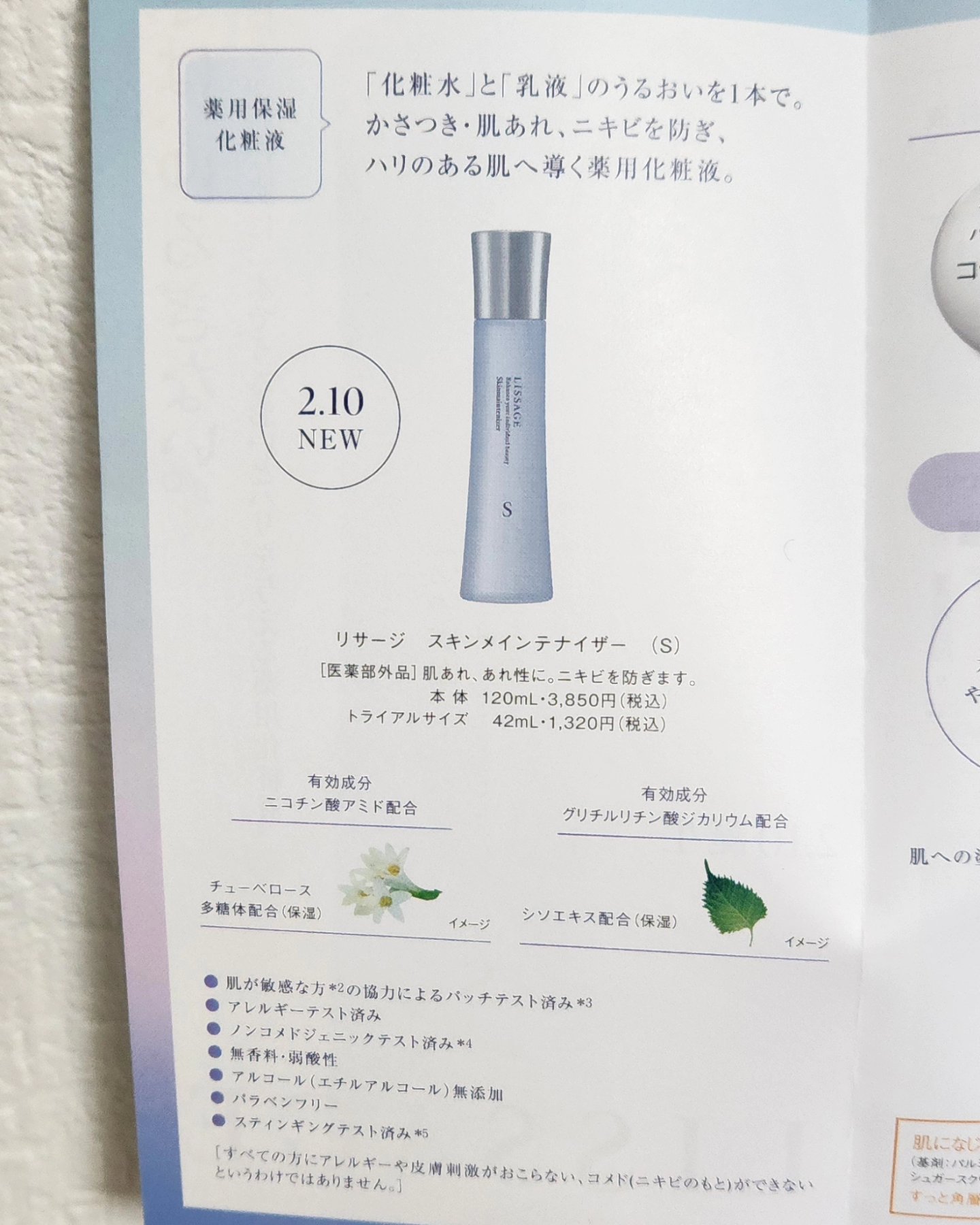 - 【医薬部外品】 「化粧水」と「乳液」のうるおいを1本で。 かさつき・肌あれ、ニキビを防ぎながらハリのある肌へ導く薬用化粧液。 ● 有効成分 ニコチン酸アミド配合 ● 有効成分 グリチルリチン酸ジカリウム配合 ● チュー ベロース多糖体( 保湿 )配合 ● シソエキス( 保湿 )配合 無香料、弱酸性、アルコール(エチルアルコール)無添加、パラベンフリー