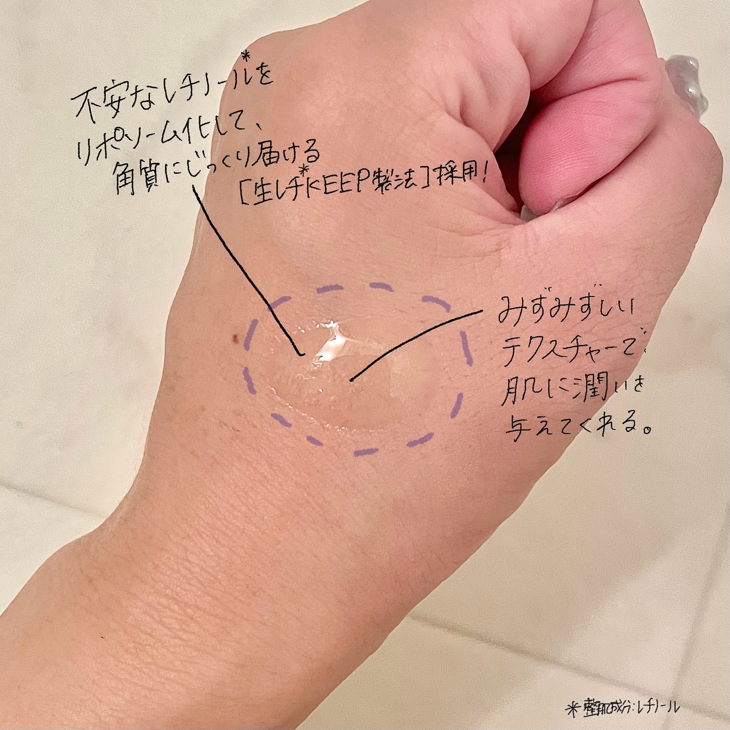 - レチノール*¹×リポソームで、ハリ・キメ整うなめらか肌へ。自分でブレンドする2 層構造のフレッシュなレチノール*¹美容液が登場! 角層への浸透の仕方が異なる2種の成 分に着目。水溶性のナイアシンアミド*²が先に届きつつ刺激を和らげ、脂溶性のレチノール*¹が後から蓋をし 、ハ リ・キメの整った 、な めらかでうるおいあふれるベビースキン*³へと導きます。さらに 、肌を水分で満たし 、光を反射したような透明感を届ける発酵成分と、角層の水分保持に効果的なセラミドNP*⁴やヒアルロン酸*⁴が 、トラブルの起こりにくい肌状態に導きます。また、フレッシュさにこだわったカチフル容器を採用。初回使用時に自分で有用成分をブレンドし、作りたてのフレッシュな生レチ*¹をご体験いただけます。 *¹ 整肌成分:レチノール *² 整肌成分 *³ うるおいで透明感のある肌印象のこと *⁴ 保湿成分