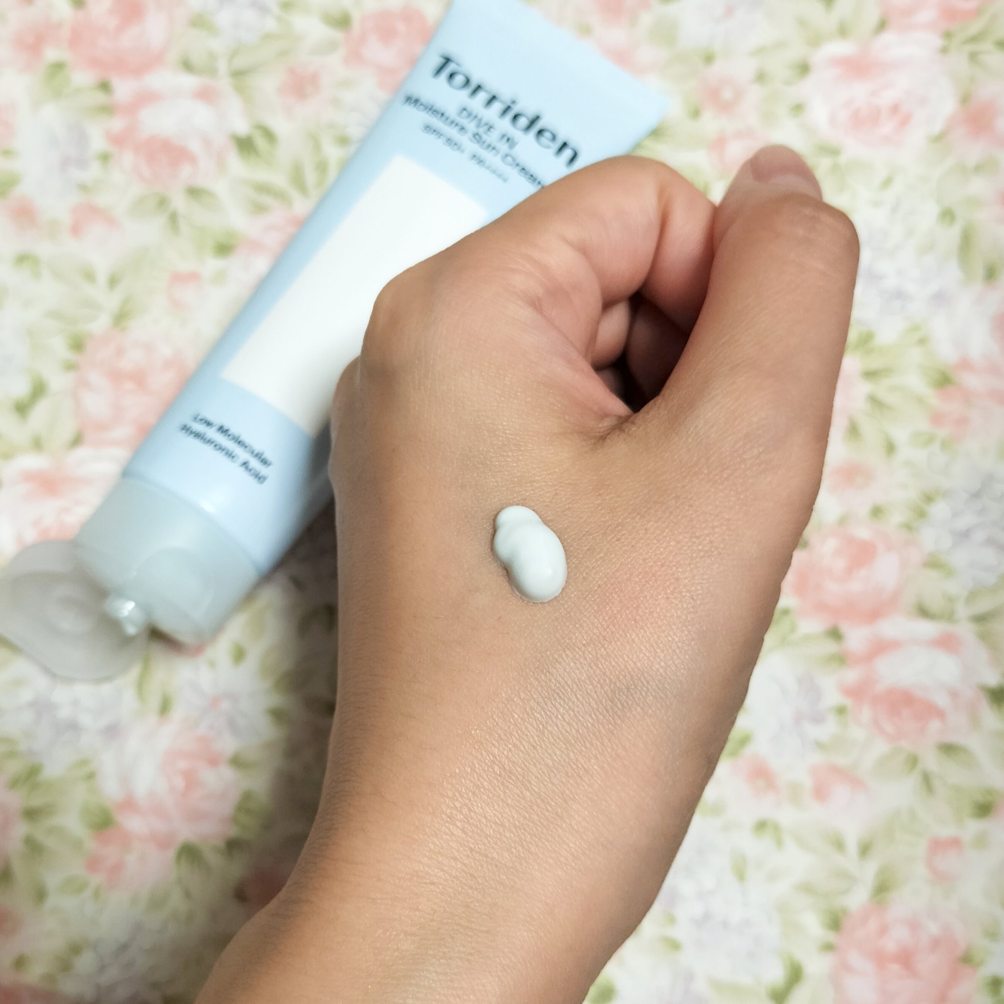 Torriden ダイブインウォータリーモイスチャーサンクリーム。無香料です。日焼け止め特有の香りは全然ありません。淡い水色でテクスチャーは程よく柔らかさがありなめらかで軽いクリームです。日焼け止め特有のキシキシ感が全然なくとても伸びがよくて...