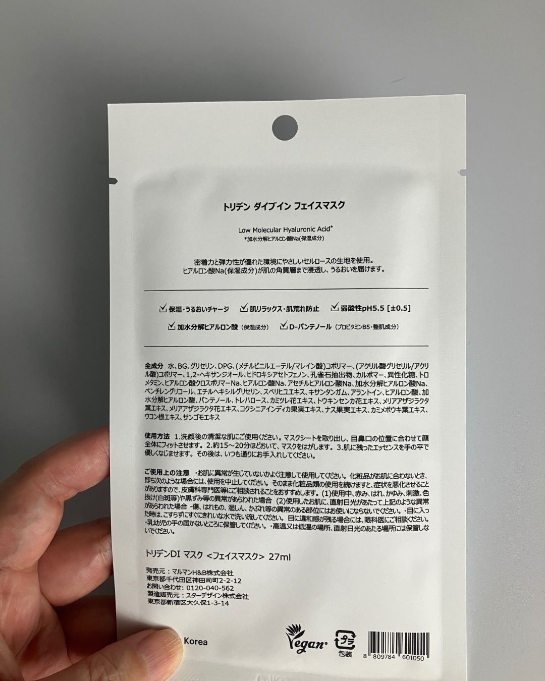 - <1枚> 水、BG、グリセリン、DPG、(メチルビニルエーテル/マレイン酸)コポリマー、(アクリル酸グリセリル/アクリル酸)コポリマー、1,2-ヘキサンジオール、ヒドロキシアセトフェノン、孔雀石抽出物、カルボマー、異性化糖、トロメタミン、ヒアルロン酸クロスポリマーNa、ヒアルロン酸Na、アセチルヒアルロン酸Na、加水分解ヒアルロン酸Na、ペンチレングリコール、エチルヘキシルグリセリン、スベリヒユエキス、キサンタンガム、アラントイン、ヒアルロン酸、加水分解ヒアルロン酸、パンテノール、トレハロース、カミツレ花エキス、トウキンセンカ花エキス、メリアアザジラクタ葉エキス、メリアアザジラクタ花エキス、コクシニアインディカ果実エキス、ナス果実エキス、カミメボウキ葉エキス、ウコン根エキス、サンゴモエキス <3枚> 水、BG、グリセリン、DPG、(メチルビニルエーテル/マレイン酸)コポリマー、(アクリル酸グリセリル/アクリル酸)コポリマー、1,2-ヘキサンジオール、ヒドロキシアセトフェノン、乳雀石抽出物、カルボマー、異性化糖、トロメタミン、ヒアルロン酸クロスポリマーNa、ヒアルロン酸Na、アセチルヒアルロン酸Na、加水分解ヒアルロン酸Na、ペンチレングリコール、エチルヘキシルグリセリン、スベリヒユエキス、キサンタンガム、アラントイン、ヒアルロン酸、加水分解ヒアルロン酸、パンテノール、トレハロース、カミツレ花エキス、トウキンセンカ花エキス、メリアアザジラクタ葉エキス、メリアアザジラクタ花エキス、コクシニアインディカ果実エキス、ナス果実エキス、カミメボウキ葉エキス、ウコン根エキス、サンゴモエキス <10枚> 水、BG、グリセリン、DPG、(メチルビニルエーテル/マレイン酸)コポリマー、(アクリル酸グリセリル/アクリル酸)コポリマー、1,2-ヘキサンジオール、ヒドロキシアセトフェノン、孔雀石抽出物、カルボマー、異性化糖、トロメタミン、ヒアルロン酸クロスポリマーNa、ヒアルロン酸Na、アセチルヒアルロン酸Na、加水分解ヒアルロン酸Na、ペンチレングリコール、エチルヘキシルグリセリン、スベリヒユエキス、キサンタンガム、アラントイン、ヒアルロン酸、加水分解ヒアルロン酸、パンテノール、トレハロース、カミツレ花エキス、トウキンセンカ花エキス、メリアアザジラクタ葉エキス、メリアアザジラクタ花エキス、コクシニアインディカ果実エキス、ナス果実エキス、カミメボウキ葉エキス、ウコン根エキス、サンゴモエキス