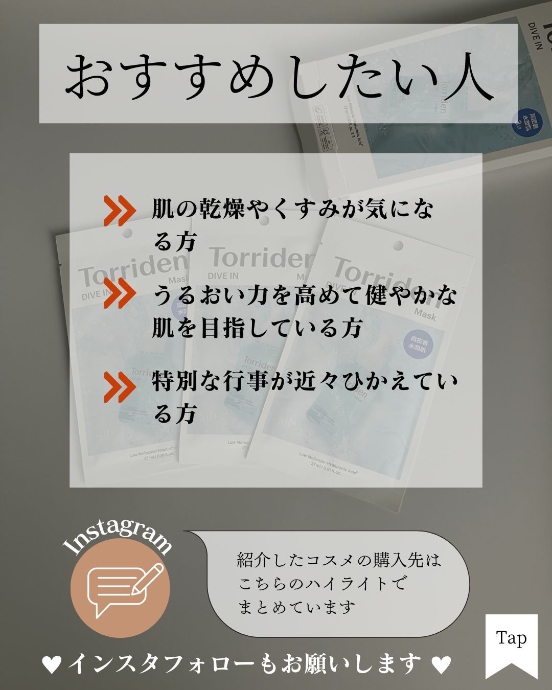 水分たっぷりの白玉肌へ❄️ Torriden トリデン ダイブインマスクパック✨ 低・中・高分子の5種類のヒアルロン酸や、D-パンテノール、アラントインを配合。 韓国コスメ評価アプリファヘビューティーアワード2年連続1位🏅💫 2023年オリーブヤングアワード マスクパック部門2位受賞の実績です。
