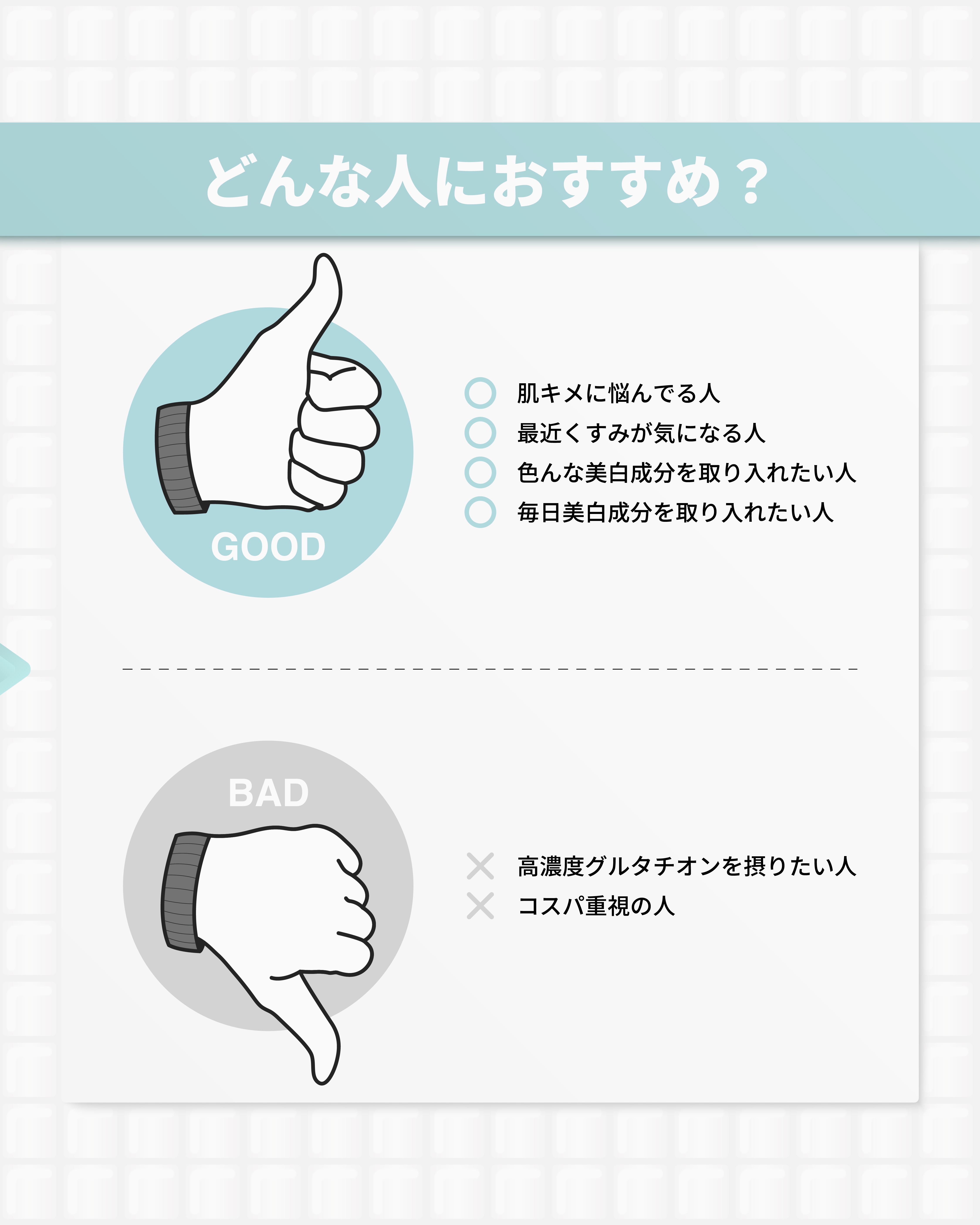 - ※初回限定品としておまけ付き商品を販売いたしますが、数量限定・在庫限りで終了とさせていただきます。尚、これにかかる商品の返品・交換は承っておりません。 グルタチオン*にビタミン成分*を足した整肌フォーミュラで外的刺激が残した乾燥ダメージをケアするトータル整肌ケア美容液。 *整肌成分 <初回限定版> 乾燥くすみケアと保湿ケアを同時に!とろとろテクスチャーの美容液。 本品+ミニサンプル付き(白玉グルタチオンCフィルムパッド 2枚 *3個入り)