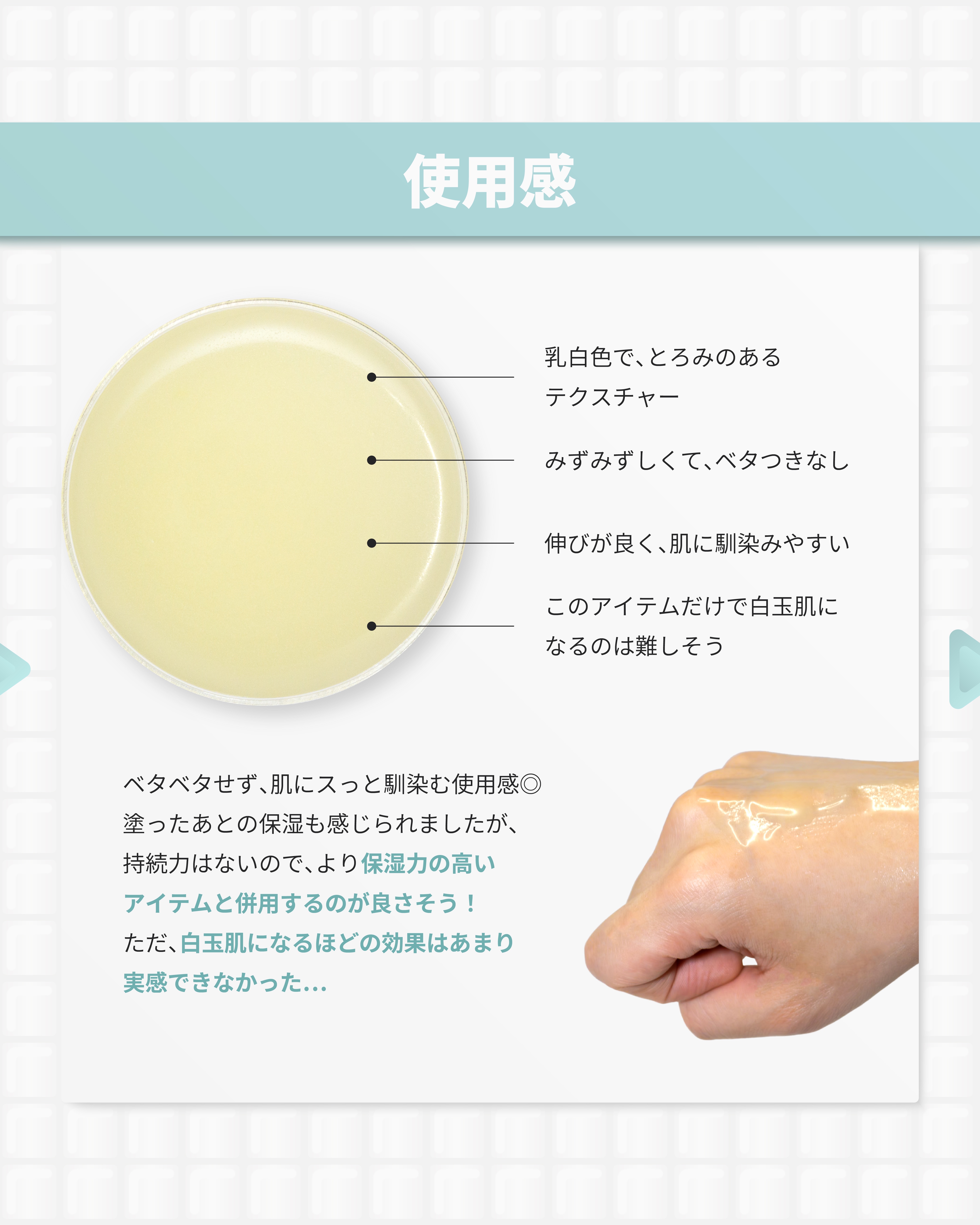 | スキンケアランキング第55位 | クリームよりこってりしてなくて、 どちらかというとすーっと伸びの良い エッセンスのようなテクスチャーでした◎ | 詳細を見る | |
