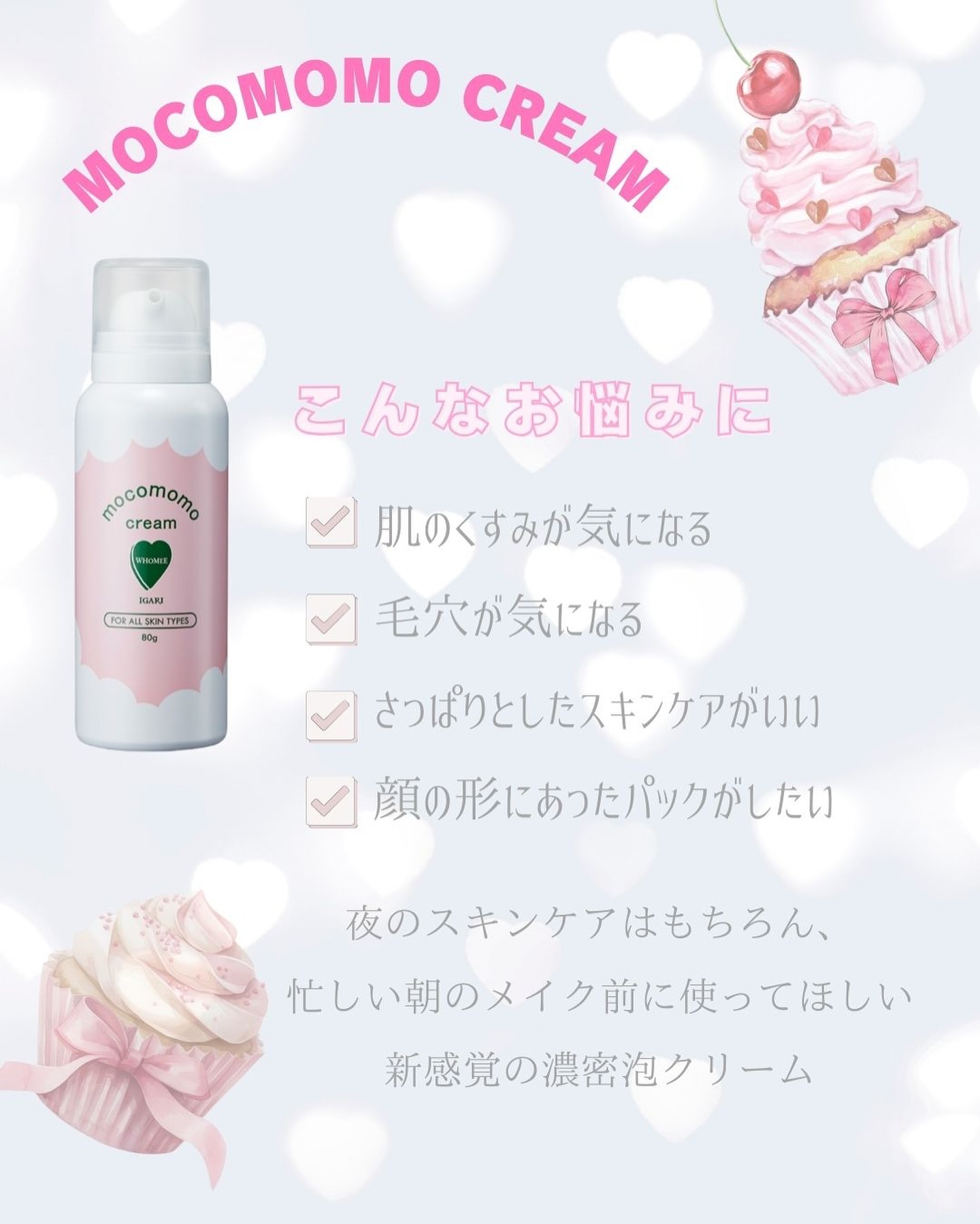 しっとりテクスチャーのもこもこ濃密泡クリーム 洗い流さずそのまま肌に浸透*させツヤのある肌に WHOMEE人気商品のエイジングケアクリームでする“おきくり”がモコモモクリームでも! もっこもこの濃密泡クリーム! ムラなく塗れて、垂れないし、ヨレないし、摩擦レスな洗い流し不要の簡単スペシャルケア🫧