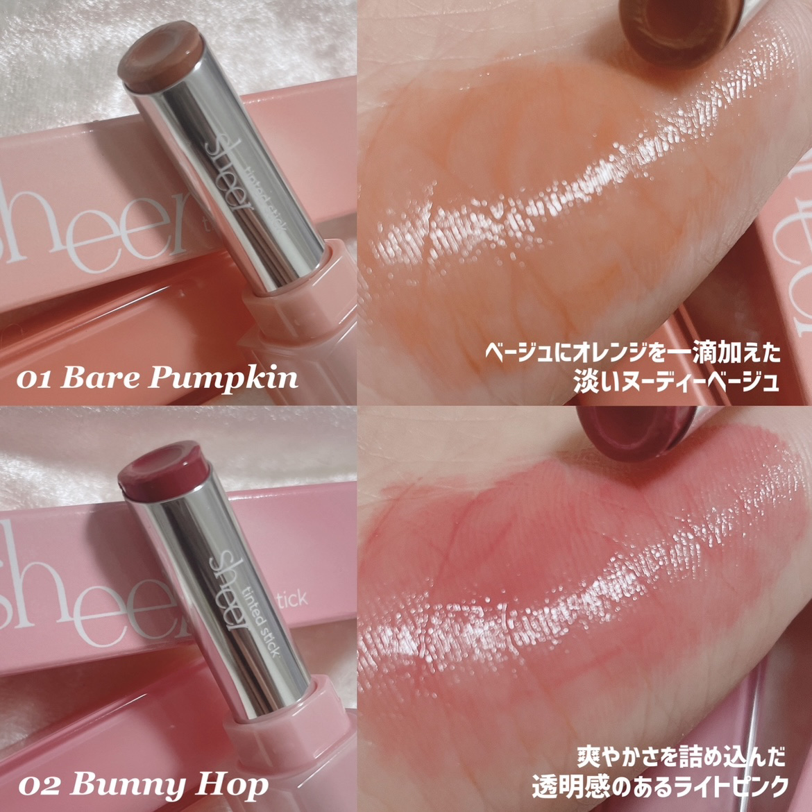- <01 ベアパンプキン(BARE PUMPKIN)> オクチルドデカノール、ペンタイソステアリン酸ジペンタエリスリチル、ジ安息香酸PG、ヘキサ脂肪酸(C5-9)ジペンタエリスリチルエステルズ、トリ(カプリル酸/カプリン酸)グリセリル、合成ワックス、水添ポリイソブテン、ダイマージリノール酸(フィトステリル/イソステアリル/セチル/ステアリル/ベヘニル)、パラフィン、グリセリン、キャンデリラロウ、フェニルプロピルジメチルシロキシケイ酸、合成フルオロフロゴパイト、水添野菜油、リンゴ酸ジイソステアリル、酸化チタン、イソステアリン酸ソルビタン、ラウリルPEG-9ポリジメチルシロキシエチルジメチコン、アルガニアスピノサ核油、トリ酢酸テトラステアリン酸スクロース、ビニルジメチコン、(セバシン酸/イソパルミチン酸)ジグリセリル、ポリヒドロキシステアリン酸、ジステアルジモニウムヘクトライト、(エチレン/プロピレン)コポリマー、トリイソステアリン酸ポリグリセリル-2、レシチン、マイクロクリスタリンワックス、ポリエチレン、水、パルミチン酸エチルヘキシル、ミリスチン酸イソプロピル、イソステアリン酸、酸化鉄、ステアリン酸ポリグリセリル-10、炭酸プロピレン、ポリリシノレイン酸ポリグリセリル-3、黄5、黄4、1,2-ヘキサンジオール、赤202、ジイソステアリン酸ポリグリセリル-2、赤104(1)、青1、トコフェロール、ハス花エキス、ニンファエアアルバ花エキス、ヤマザクラ花エキス、ハイブリッドローズ花エキス、ソルビン酸K <02 バニーホップ(BUNNY HOP)> オクチルドデカノール、ペンタイソステアリン酸ジペンタエリスリチル、ジ安息香酸PG、ヘキサ脂肪酸(C5-9)ジペンタエリスリチルエステルズ、トリ(カプリル酸/カプリン酸)グリセリル、合成ワックス、水添ポリイソブテン、ダイマージリノール酸(フィトステリル/イソステアリル/セチル/ステアリル/ベヘニル)、パラフィン、グリセリン、リンゴ酸ジイソステアリル、キャンデリラロウ、フェニルプロピルジメチルシロキシケイ酸、合成フルオロフロゴパイト、酸化チタン、水添野菜油、イソステアリン酸ソルビタン、ラウリルPEG-9ポリジメチルシロキシエチルジメチコン、アルガニアスピノサ核油、トリ酢酸テトラステアリン酸スクロース、ビニルジメチコン、(セバシン酸/イソパルミチン酸)ジグリセリル、ポリヒドロキシステアリン酸、ジステアルジモニウムヘクトライト、(エチレン/プロピレン)コポリマー、トリイソステアリン酸ポリグリセリル-2、マイクロクリスタリンワックス、レシチン、ポリエチレン、水、パルミチン酸エチルヘキシル、ミリスチン酸イソプロピル、イソステアリン酸、ステアリン酸ポリグリセリル-10、酸化鉄、炭酸プロピレン、黄4、ポリリシノレイン酸ポリグリセリル-3、赤227、1,2-ヘキサンジオール、赤202、黄5、ジイソステアリン酸ポリグリセリル-2、青1、トコフェロール、ハス花エキス、ニンファエアアルバ花エキス、ヤマザクラ花エキス、ハイブリッドローズ花エキス、ソルビン酸K <03 タフィーベリー(TAFFY BERRY)> オクチルドデカノール、ペンタイソステアリン酸ジペンタエリスリチル、ジ安息香酸PG、ヘキサ脂肪酸(C5-9)ジペンタエリスリチルエステルズ、トリ(カプリル酸/カプリン酸)グリセリル、合成ワックス、水添ポリイソブテン、ダイマージリノール酸(フィトステリル/イソステアリル/セチル/ステアリル/ベヘニル)、パラフィン、グリセリン、キャンデリラロウ、フェニルプロピルジメチルシロキシケイ酸、合成フルオロフロゴパイト、水添野菜油、リンゴ酸ジイソステアリル、酸化チタン、イソステアリン酸ソルビタン、ラウリルPEG-9ポリジメチルシロキシエチルジメチコン、アルガニアスピノサ核油、トリ酢酸テトラステアリン酸スクロース、ビニルジメチコン、(セバシン酸/イソパルミチン酸)ジグリセリル、トリイソステアリン酸ポリグリセリル-2、ポリヒドロキシステアリン酸、ジステアルジモニウムヘクトライト、(エチレン/プロピレン)コポリマー、黄4、マイクロクリスタリンワックス、レシチン、ポリエチレン、水、パルミチン酸エチルヘキシル、ミリスチン酸イソプロピル、イソステアリン酸、ステアリン酸ポリグリセリル-10、酸化鉄、炭酸プロピレン、赤202、赤227、ポリリシノレイン酸ポリグリセリル-3、ジイソステアリン酸ポリグリセリル-2、1,2-ヘキサンジオール、黄5、トコフェロール、ハス花エキス、ニンファエアアルバ花エキス、ヤマザクラ花エキス、ハイブリッドローズ花エキス、ソルビン酸K <04 キャメルナッツ(CAMEL NUTS)> オクチルドデカノール、ペンタイソステアリン酸ジペンタエリスリチル、ジ安息香酸PG、ヘキサ脂肪酸(C5-9)ジペンタエリスリチルエステルズ、トリ(カプリル酸/カプリン酸)グリセリル、合成ワックス、水添ポリイソブテン、ダイマージリノール酸(フィトステリル/イソステアリル/セチル/ステアリル/ベヘニル)、パラフィン、グリセリン、リンゴ酸ジイソステアリル、キャンデリラロウ