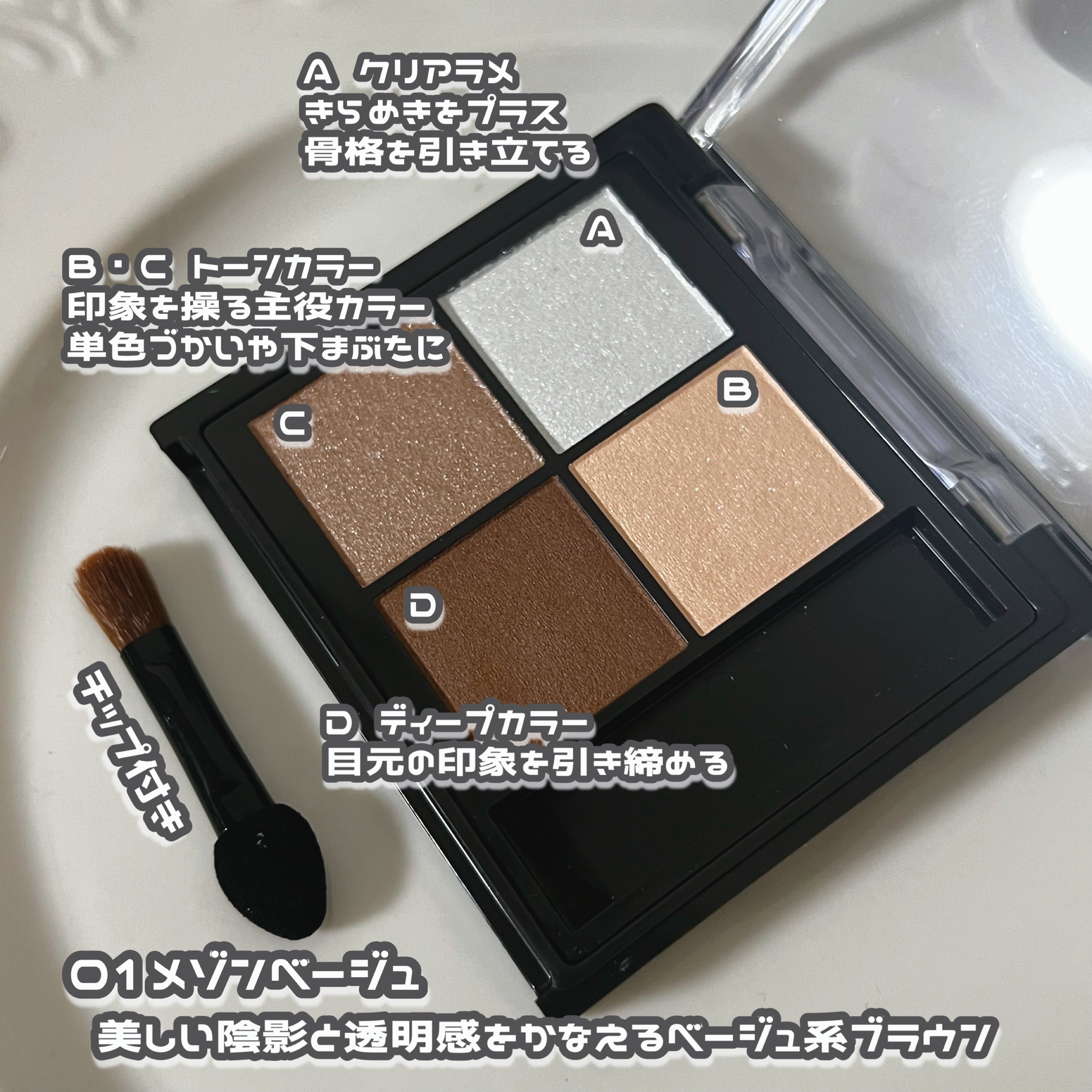 - まぶたに溶け込むような繊細グラデで奥行きのある目元へ ●しっとりなめらかなテクスチャー モイストプレス製法 パウダーなのにやわらかくしっとりとした質感を実現。まぶたに上品なツヤをもたらします。 ●目元を立体的に引き立てる シェードカラー設計 質感の異なるクリアラメ、トーンカラー、ディープカラーで構成されたこだわりの4色を配置。 重ねてもくすみにくい発色でまぶたに陰影をもたらし、目元を立体的に演出します。 ●まぶたに密着して美しい仕上がりが続く 高密着フィット処方 時間がたってもヨレや粉落ちしにくく、美しい仕上がりが続きます。 ●うるおい美容液成分配合 ヒアルロン酸・コラーゲン・ローヤルゼリーエキス・カミツレエキス