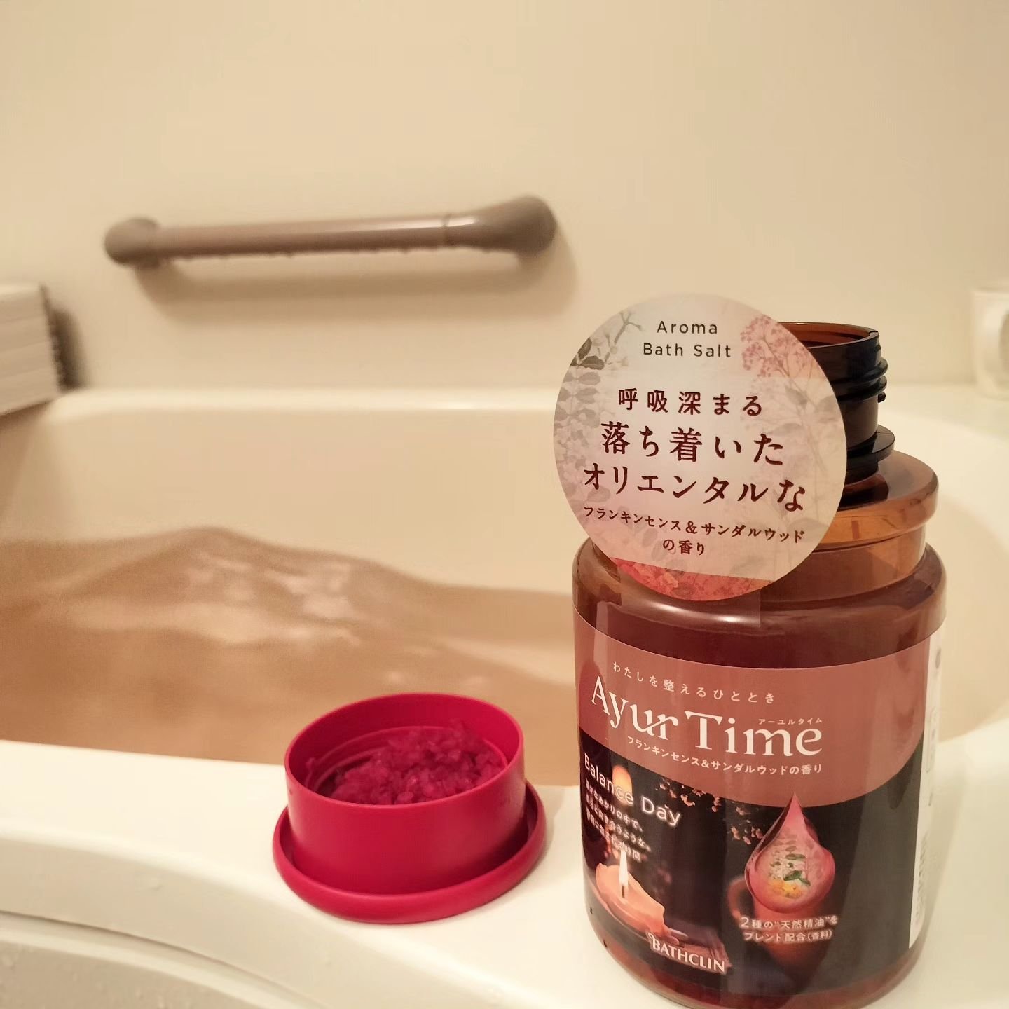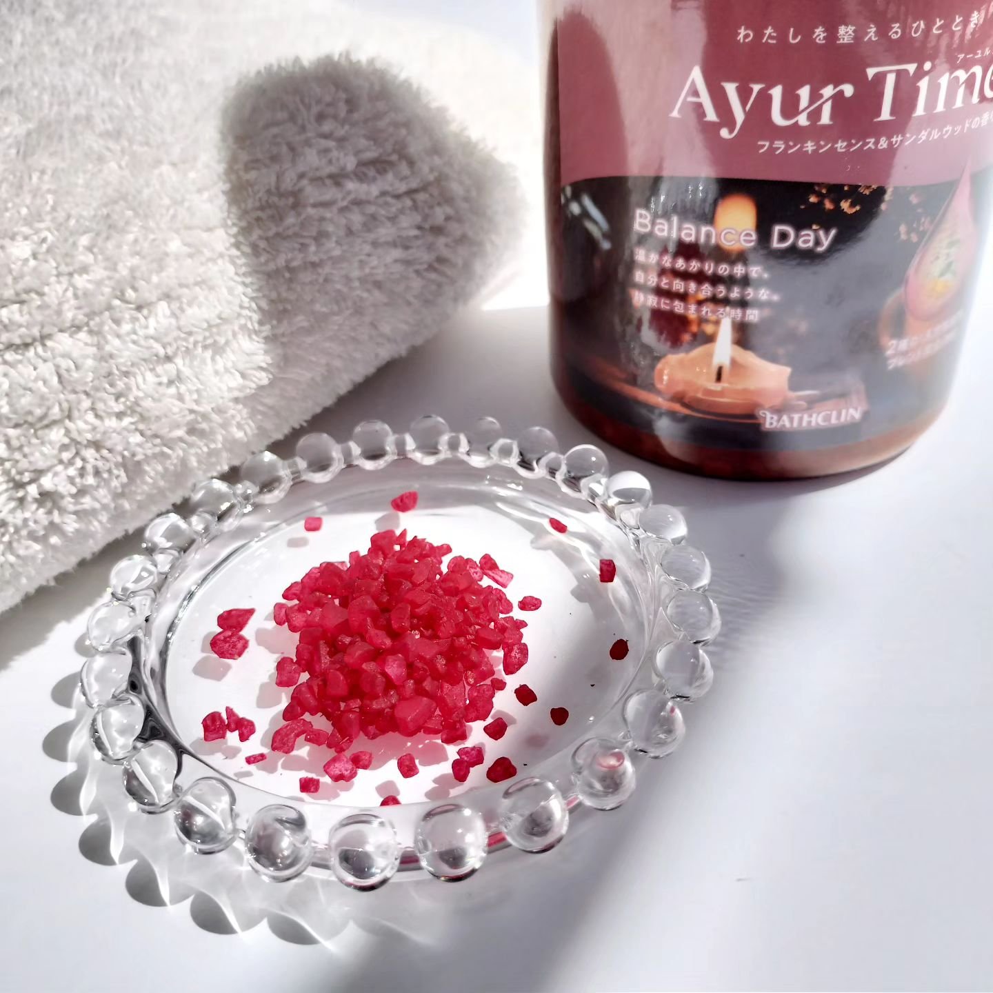 今夜の入浴剤はわたしを整えるひととき Ayu Time(アーユルタイム) 真っ赤なお風呂が情熱的でしょ❤️🔥 溶けるのが早くて香りもよろしいのよ。 植物系保護成分配合ヒマラヤンラズベリーエキス オーガニックセサミオイル