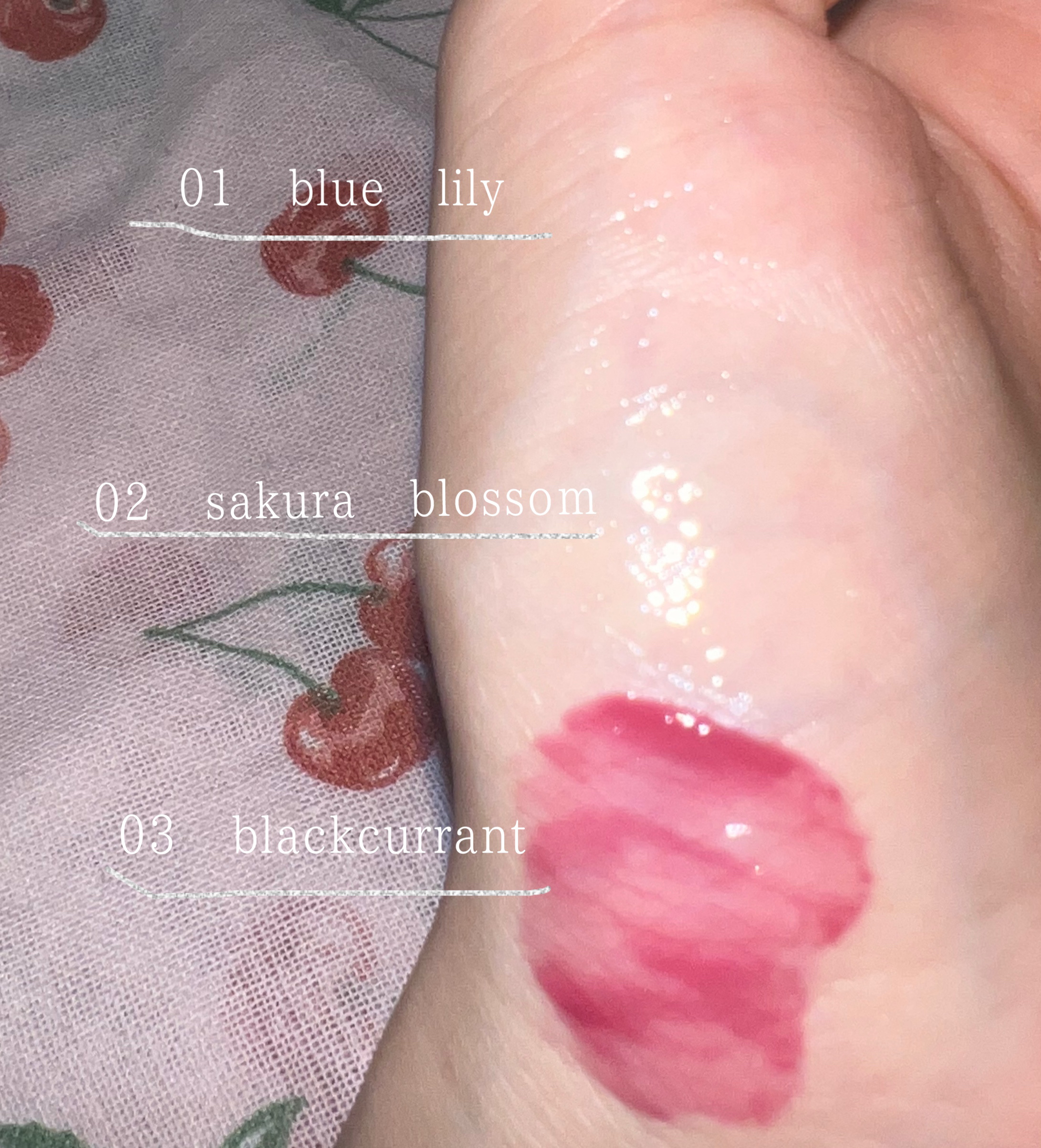 - <01 blue lily> トリイソステアリン酸ポリグリセリル-2、ワセリン、ポリブテン、ダイマージリノール酸(フィトステリル/イソステアリル/セチル/ステアリル/ベヘニル)、オクチルドデカノール、ダイマージリノール酸ダイマージリノレイルビスイソステアリル、ジメチルシリル化シリカ、シリカ、パルミチン酸デキストリン、アストロカリウムムルムル種子脂、アセチルヒアルロン酸Na、カニナバラ果実油、ジパルミチン酸アスコルビル、セイヨウハッカ葉エキス、ゼニアオイ花/葉/茎エキス、トコトリエノール、トコフェロール、バオバブ種子油、パルミチン酸アスコルビル、マドンナリリー根エキス、BG、BHT、DPG、(エチレン/プロピレン)コポリマー、キサンタンガム、コメヌカ油、ジフェニルシロキシフェニルトリメチコン、ジメチコン、スクワラン、テトラ(ジ-t-ブチルヒドロキシヒドロケイヒ酸)ペンタエリスリチル、トリイソステアリン酸イソプロピルチタン、トリエチルヘキサノイン、ハイドロゲンジメチコン、バニリルブチル、ポリプロピレン、ミネラルオイル、メタクリル酸メチルクロスポリマー、メチコン、メントール、レシチン、水、水酸化Al、炭酸Ca、フェノキシエタノール、香料、グンジョウ、酸化チタン、酸化鉄、青1、赤202 <02 sakura blossom> トリイソステアリン酸ポリグリセリル-2、ワセリン、ポリブテン、ダイマージリノール酸(フィトステリル/イソステアリル/セチル/ステアリル/ベヘニル)、オクチルドデカノール、ダイマージリノール酸ダイマージリノレイルビスイソステアリル、ジメチルシリル化シリカ、シリカ、パルミチン酸デキストリン、アストロカリウムムルムル種子脂、アセチルヒアルロン酸Na、カニナバラ果実油、ジパルミチン酸アスコルビル、セイヨウハッカ葉エキス、ゼニアオイ花/葉/茎エキス、ソメイヨシノ葉エキス、トコトリエノール、トコフェロール、バオバブ種子油、パルミチン酸アスコルビル、BG、BHT、DPG、(エチレン/プロピレン)コポリマー、キサンタンガム、コメヌカ油、ジフェニルシロキシフェニルトリメチコン、ジメチコン、スクワラン、テトラ(ジ-t-ブチルヒドロキシヒドロケイヒ酸)ペンタエリスリチル、トリイソステアリン酸イソプロピルチタン、トリエチルヘキサノイン、ハイドロゲンジメチコン、バニリルブチル、ポリプロピレン、ミネラルオイル、メタクリル酸メチルクロスポリマー、メチコン、メントール、レシチン、水、水酸化Al、炭酸Ca、フェノキシエタノール、香料、酸化チタン、酸化鉄、黄4、赤202 <03 blackcurrant> トリイソステアリン酸ポリグリセリル-2、ワセリン、ポリブテン、ダイマージリノール酸(フィトステリル/イソステアリル/セチル/ステアリル/ベヘニル)、オクチルドデカノール、ダイマージリノール酸ダイマージリノレイルビスイソステアリル、ジメチルシリル化シリカ、シリカ、パルミチン酸デキストリン、アストロカリウムムルムル種子脂、アセチルヒアルロン酸Na、カニナバラ果実油、クロフサスグリ果実エキス、ジパルミチン酸アスコルビル、セイヨウハッカ葉エキス、ゼニアオイ花/葉/茎エキス、トコトリエノール、トコフェロール、バオバブ種子油、パルミチン酸アスコルビル、BG、BHT、DPG、(エチレン/プロピレン)コポリマー、キサンタンガム、コメヌカ油、ジフェニルシロキシフェニルトリメチコン、ジメチコン、スクワラン、テトラ(ジ-t-ブチルヒドロキシヒドロケイヒ酸)ペンタエリスリチル、トリイソステアリン酸イソプロピルチタン、トリエチルヘキサノイン、ハイドロゲンジメチコン、バニリルブチル、ポリプロピレン、ミネラルオイル、メタクリル酸メチルクロスポリマー、メチコン、メントール、レシチン、水、水酸化Al、炭酸Ca、フェノキシエタノール、香料、酸化チタン、酸化鉄、黄4、赤202 <04 tint peach(限定)> ポリブテン、トリメリト酸トリトリデシル、ミネラルオイル、リンゴ酸ジイソステアリル、パルミチン酸デキストリン、トリイソステアリン酸ポリグリセリル-2、ジメチルシリル化シリカ、カニナバラ果実油、ジパルミチン酸アスコルビル、トコトリエノール、トコフェロール、バオバブ種子油、パルミチン酸アスコルビル、ホホバ種子油、モモ核油、BHT、DPG、(アクリル酸/アクリル酸アルキル(C10-30))コポリマー、(パルミチン酸/エチルヘキサン酸)デキストリン、オクチルドデカノール、コメヌカ油、ジフェニルシロキシフェニルトリメチコン、ジメチコン、スクワラン、テトラ(ジ-t-ブチルヒドロキシヒドロケイヒ酸)ペンタエリスリチル、トリエチルヘキサノイン、バニリルブチル、ポリプロピレン、メントール、フェノキシエタノール、香料、赤218