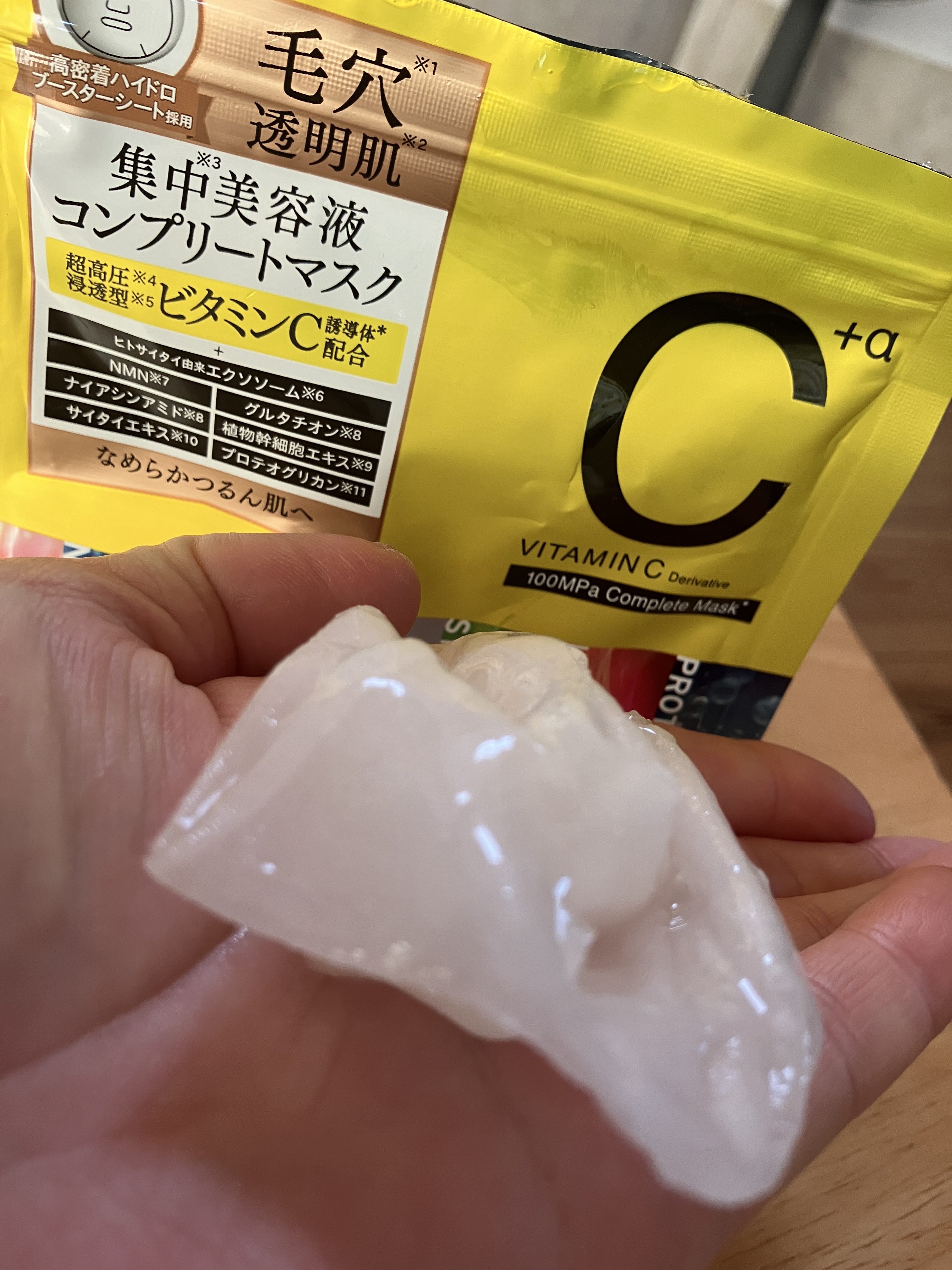 超高圧浸透型美容液成分配合。高密着シートマスクで肌にぐんぐん浸透。 美容液たっぷりでシャバシャバ系。シートマスクはやや厚みのあるタイプで密着感もあります♡ でも次の日のお肌は、水分たっぷりな感じで良かったです💛