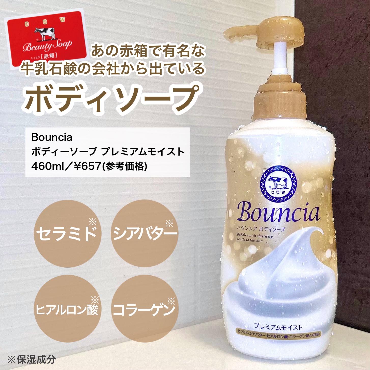 牛乳石鹸さまからいただきました🐄⸒⸒〖バウンシアボディソーププレミアムモイスト〗「バウンドするような泡」という意味がこめられた、牛乳石鹸のボディソープブランド“バウンシア”🤍1PUSHでしっかりと泡立ち、もっちり濃厚クリーム泡で摩擦レスで肌を...