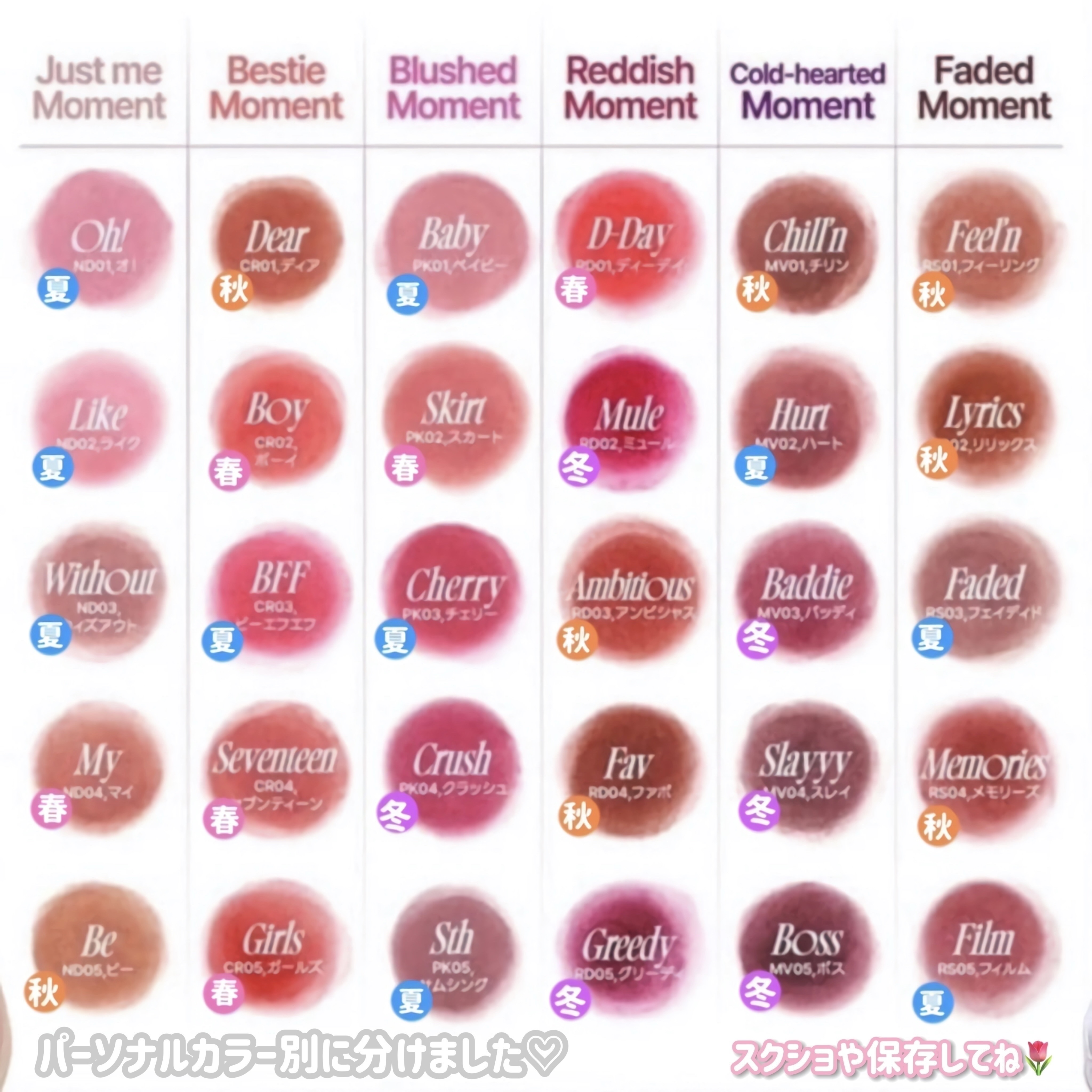 - <CR01 ディア> ダイメジメチコン、(ジメチコン/ビニルジメチコン)クロスポリマー、トリベヘニン、トリイソステアリン酸ポリグリセリル-2、リンゴ酸ジイソステアリル、合成フルオロフロゴパイト、二酸化チタン(CI 77891)、黄色酸化鉄(CI 77492)、カカオシードバター、ブルーアガベ葉エキス、セチルPEG/PPG-10/1ダイメチコン、イソステアリン酸ソルビタン、ビニルジメチコン/メチコンシルセスキオキサン)クロスポリマー、ポリヒドロキシステアリック酸、ジステアルジモニウムヘクトライト、パルミチン酸エチルヘキシル、ラウロイルサルコシン酸ナトリウム、アイソステアリック酸、レシチン、ジイソステアリン酸ポリグリセリル-2、ポリリシノレイン酸ポリグリセリル-3、クエン酸トリエチル、カプリリルグリコール、カプリル酸グリセリル、BG、精製水、香料、黄色5号(CI 15985)、赤色酸化鉄(CI 77491)、赤202(CI 15850)、黒色酸化鉄(CI 77499) <CR02 ボーイ> ダイメジメチコン、(ジメチコン/ビニルジメチコン)クロスポリマー、トリベヘニン、合成フルオロフロゴパイト、リンゴ酸ジイソステアリル、二酸化チタン(CI 77891)、トリイソステアリン酸ポリグリセリル-2、カカオシードバター、ブルーアガベ葉エキス、セチルPEG/PPG-10/1ダイメチコン、イソステアリン酸ソルビタン、ビニルジメチコン/メチコンシルセスキオキサン)クロスポリマー、ポリヒドロキシステアリック酸、ジステアルジモニウムヘクトライト、ジイソステアリン酸ポリグリセリル-2、パルミチン酸エチルヘキシル、ラウロイルサルコシン酸ナトリウム、アイソステアリック酸、レシチン、ポリリシノレイン酸ポリグリセリル-3、クエン酸トリエチル、カプリリルグリコール、カプリル酸グリセリル、BG、精製水、香料、黄色5号(CI 15985)、赤色104号(1) (CI 45410)、赤色酸化鉄(CI 77491)、赤202(CI 15850)、黄色4号(CI 19140) <CR03 ビーエフエフ> ダイメジメチコン、(ジメチコン/ビニルジメチコン)クロスポリマー、トリベヘニン、トリイソステアリン酸ポリグリセリル-2、リンゴ酸ジイソステアリル、合成フルオロフロゴパイト、二酸化チタン(CI 77891)、赤色104号(1) (CI 45410)、カカオシードバター、ブルーアガベ葉エキス、セチルPEG/PPG-10/1ダイメチコン、イソステアリン酸ソルビタン、ビニルジメチコン/メチコンシルセスキオキサン)クロスポリマー、ポリヒドロキシステアリック酸、ジイソステアリン酸ポリグリセリル-2、ジステアルジモニウムヘクトライト、パルミチン酸エチルヘキシル、ラウロイルサルコシン酸ナトリウム、アイソステアリック酸、レシチン、ポリリシノレイン酸ポリグリセリル-3、クエン酸トリエチル、カプリリルグリコール、カプリル酸グリセリル、BG、精製水、香料、黄色4号(CI 19140)、黄色酸化鉄(CI 77492)、赤202(CI 15850)、赤色201号 (CI 15850) <CR04 セブンティーン> ダイメジメチコン、(ジメチコン/ビニルジメチコン)クロスポリマー、トリベヘニン、リンゴ酸ジイソステアリル、トリイソステアリン酸ポリグリセリル-2、合成フルオロフロゴパイト、二酸化チタン、カカオシードバター、ブルーアガベ葉エキス、セチルPEG/PPG-10/1ダイメチコン、イソステアリン酸ソルビタン、ビニルジメチコン/メチコンシルセスキオキサン)クロスポリマー、ポリヒドロキシステアリック酸、ジステアルジモニウムヘクトライト、ジイソステアリン酸ポリグリセリル-2、パルミチン酸エチルヘキシル、ラウロイルサルコシン酸ナトリウム、アイソステアリック酸、レシチン、ポリリシノレイン酸ポリグリセリル-3、クエン酸トリエチル、カプリリルグリコール、カプリル酸グリセリル、BG、精製水、香料、赤色酸化鉄、赤色201号、黄色4号、赤色202号、黄色酸化鉄 <CR05 ガールズ> ダイメジメチコン、(ジメチコン/ビニルジメチコン)クロスポリマー、トリベヘニン、トリイソステアリン酸ポリグリセリル-2、合成フルオロフロゴパイト、黄色5号(CI 15985)、リンゴ酸ジイソステアリル、カカオシードバター、ブルーアガベ葉エキス、セチルPEG/PPG-10/1ダイメチコン、イソステアリン酸ソルビタン、ビニルジメチコン/メチコンシルセスキオキサン)クロスポリマー、ポリヒドロキシステアリック酸、ジイソステアリン酸ポリグリセリル-2、ジステアルジモニウムヘクトライト、パルミチン酸エチルヘキシル、ラウロイルサルコシン酸ナトリウム、アイソステアリック酸、レシチン、ポリリシノレイン酸ポリグリセリル-3、クエン酸トリエチル、カプリリルグリコール、カプリル酸グリセリル、BG、精製水、香料、黄色4号(CI 19140)、赤202(CI 15850)、二酸化チタン(CI 77891)、赤色201号 (CI 15850) <MV01 チリン> ダイメジメチコン、(ジメチコン/ビニルジメチコン)クロスポリマー、トリベヘニン、トリイソステアリン酸ポリグリセリル-2、リンゴ酸ジイソステアリル、合成フルオロフロゴパイト、酸化チタン (CI 77891)、赤色酸化鉄(CI 77491)、黄色酸化鉄(CI 77492)、カカオシードバター、ブルーアガベ葉エキス、セチルPEG/PPG-10/1ダイメチコン、イソス