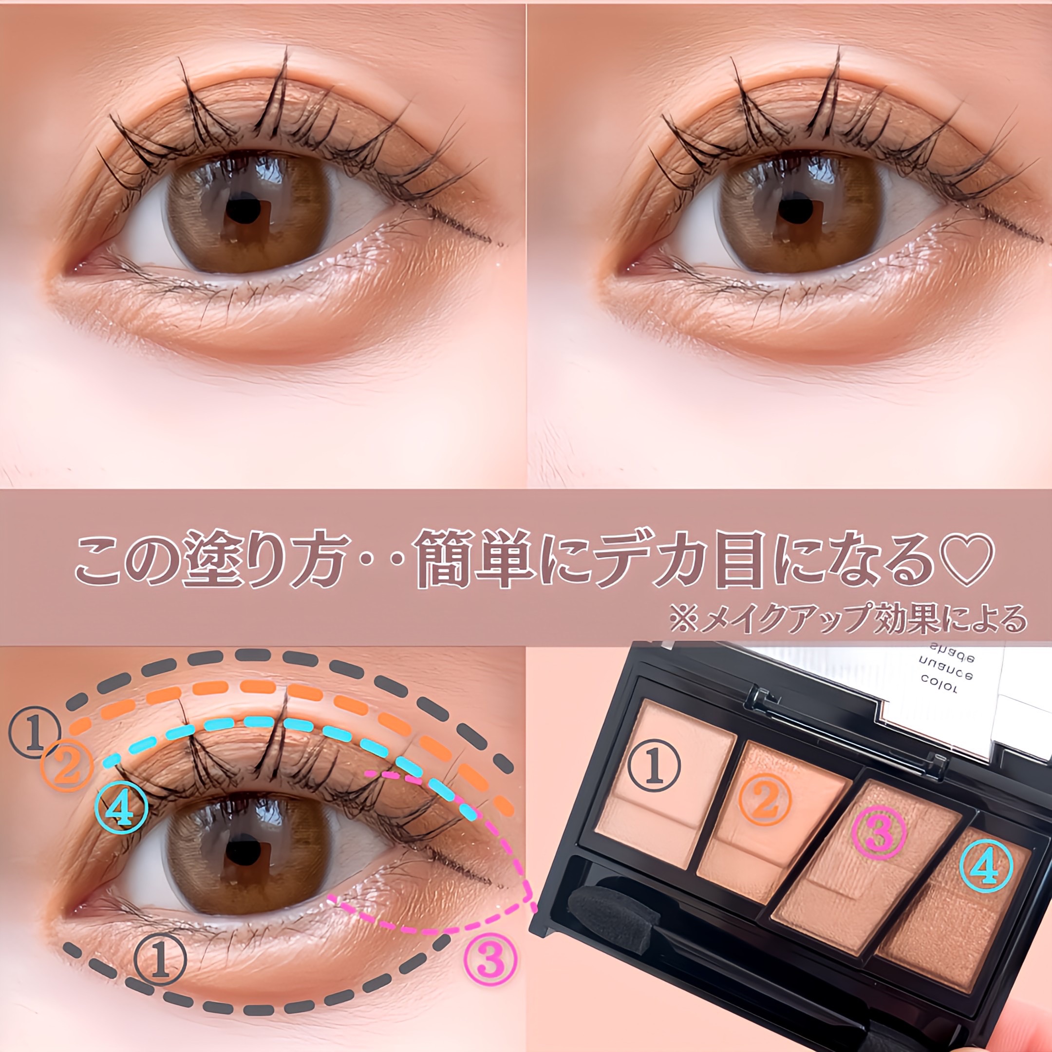 - カラーニュアンスシェードを目尻に入れるだけで目幅を大きく見せ※、抜け感のある明るい大きな目元に仕上るブラウンアイシャドウ。 ブラウン×カラーニュアンスの4色セット。※メイクアップ効果