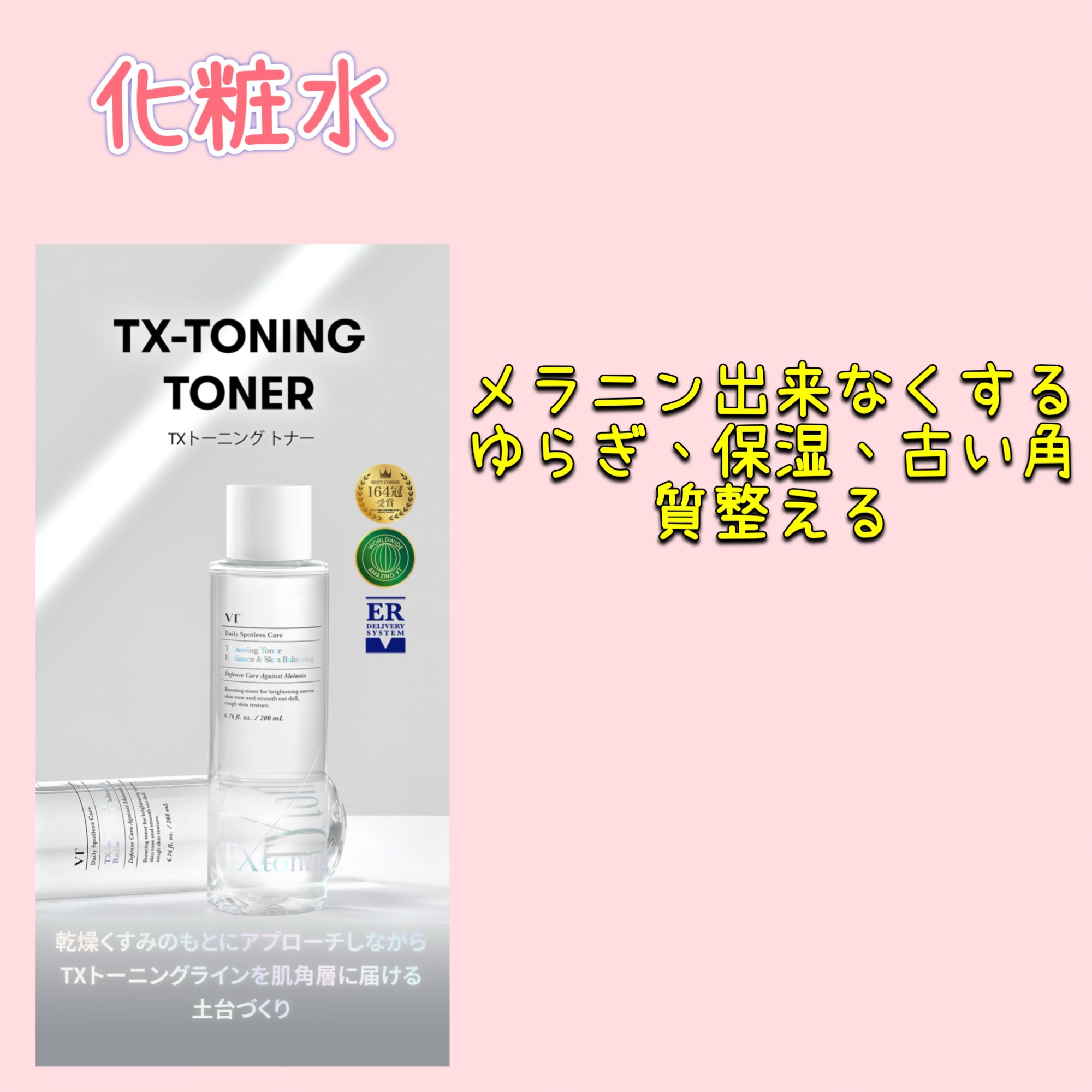 - <TXトーニングトナー> 水、グリセリン、ナイアシンアミド、プロパンジオール、1,2-ヘキサンジオール、トラネキサム酸、エリスリトール、カルボマー、トレハロース、アデノシン、アルギニン、EDTA二ナトリウム、アラントイン、キサンタンガム、グルタチオン、グリチルリチン酸、水添レシチン、マカダミアテルニフォリア種子油、スクワラン、パパイン、マデカソシド、セラミドNP、ツボクサ葉エキス、アジアチコサイド、ステアリン酸、コレステロール、マルトデキストリン