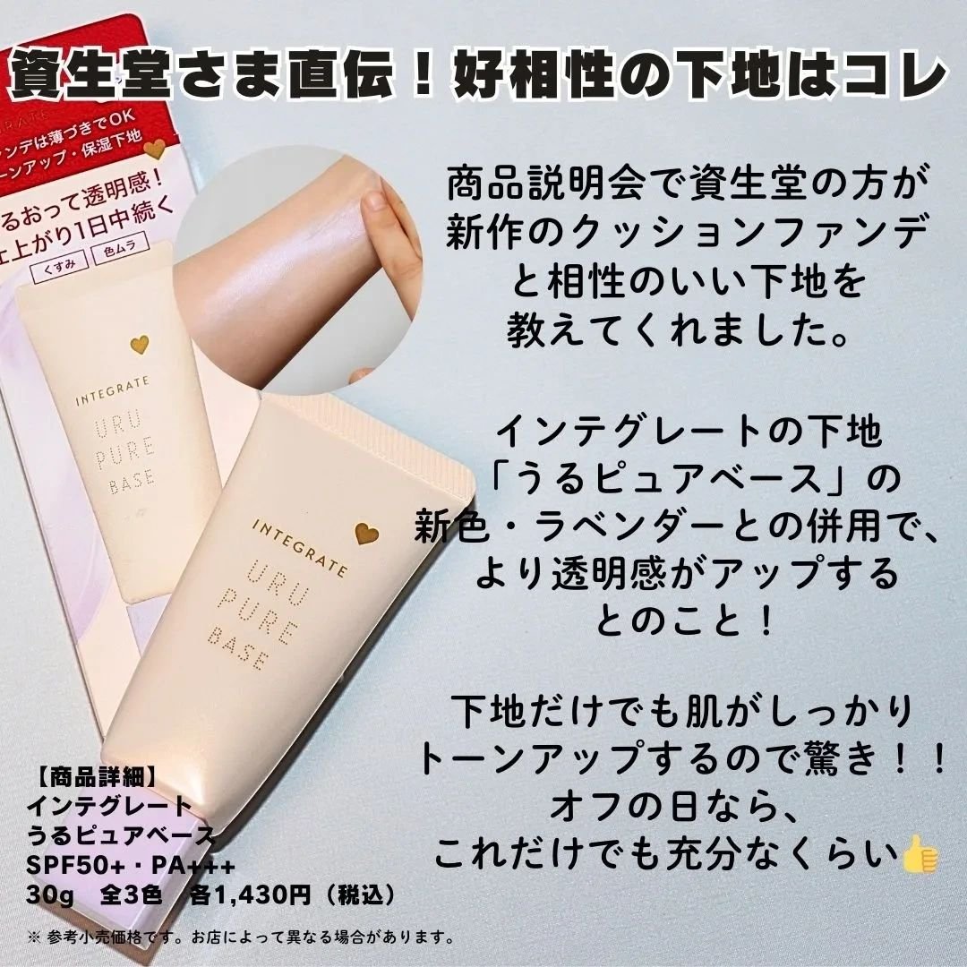 クッションファンデはとにかくハイカバーでツヤ肌🫧 シミや赤み、毛穴も隠してくれて使いやすい! 下地「うるピュアベース」は少し使いにくいかも… ラベンダーのコントロールカラーなので、色むらやくすみは飛ばしてくれるので部分使いには良いかも知れません。 特にお勧めするのは「プロフィニッシュクッション」 なのでぜひ新しいクッションファンデお探しの方は手にとってみて下さいね✨
