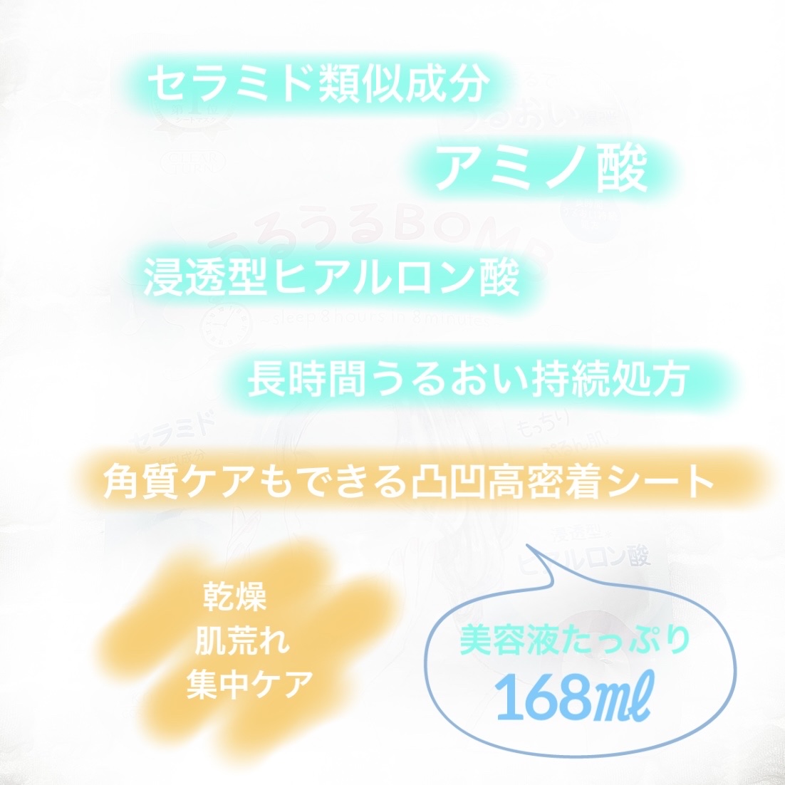 - とにかく乾燥で悩む肌に 爆弾級のうるおいつづく『うるおい爆弾★マスク』 ❶ 超しっとり!『長時間うるおい持続処方』 ひどく乾燥してあれがちな肌も保湿環境をととのえ ぷるんとはずむもっちりうるおい肌へ ❷心地よい眠りへみちびくようなリラックスフローラルの香り やさしい使い心地 弱酸性・無着色・無鉱物油・アルコールフリー(エチルアルコール) パラベンフリー・紫外線吸収剤フリー・シリコーンフリー ※2024年2月21日〜パッケージリニューアル。