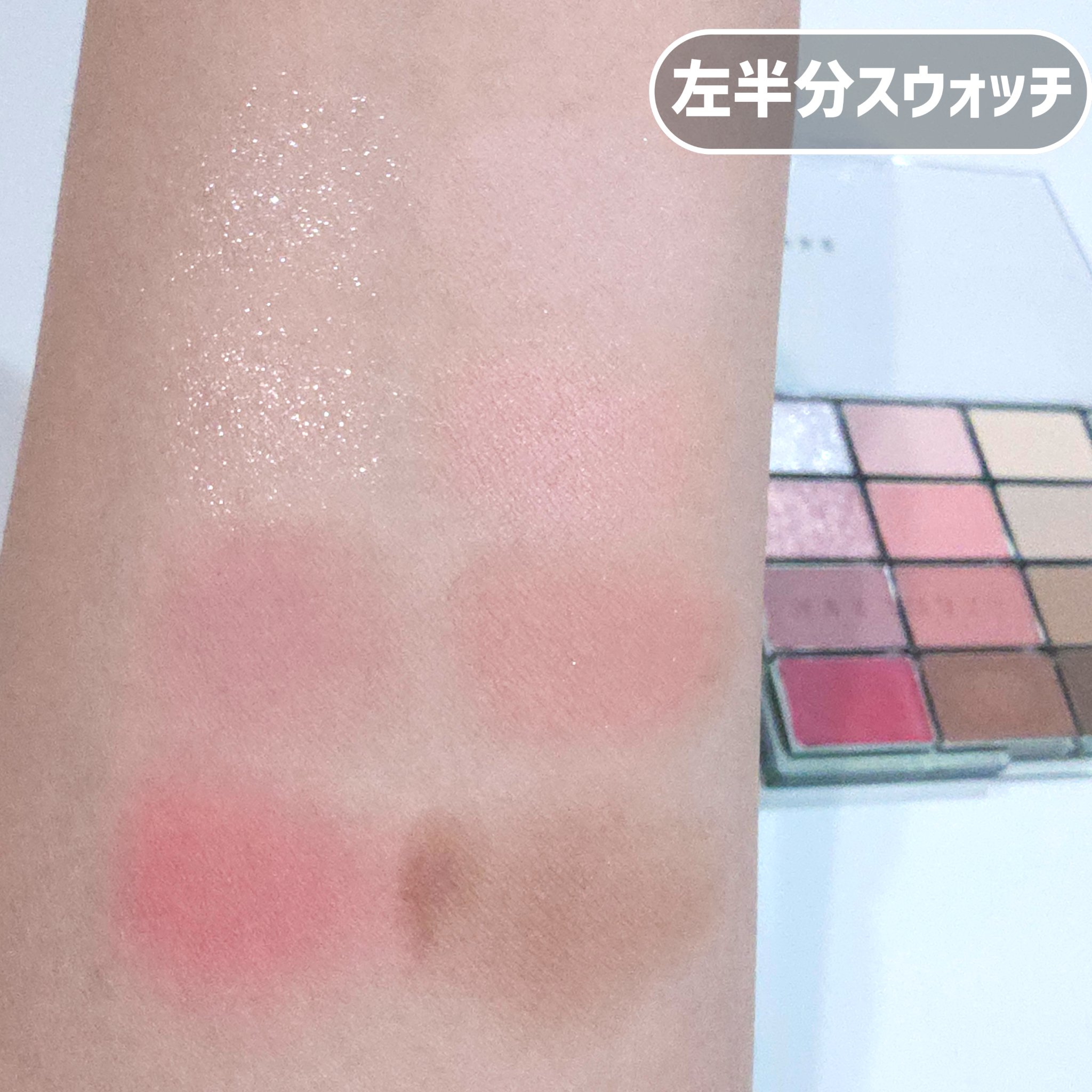 全体のローズ感と粉質もたまらなくいいんですが 左下のハイライトカラー?パールの粉が すんごい涙袋にいいんですよ… パーンとめちゃくちゃ涙袋盛れるけど、 ほんのりピンクがかった白みベージュなので 平成ギャルみたいになるわけではない…と思う ほんとこのハイライトカラーが涙袋に良すぎて いつかここだけ底見えする説…