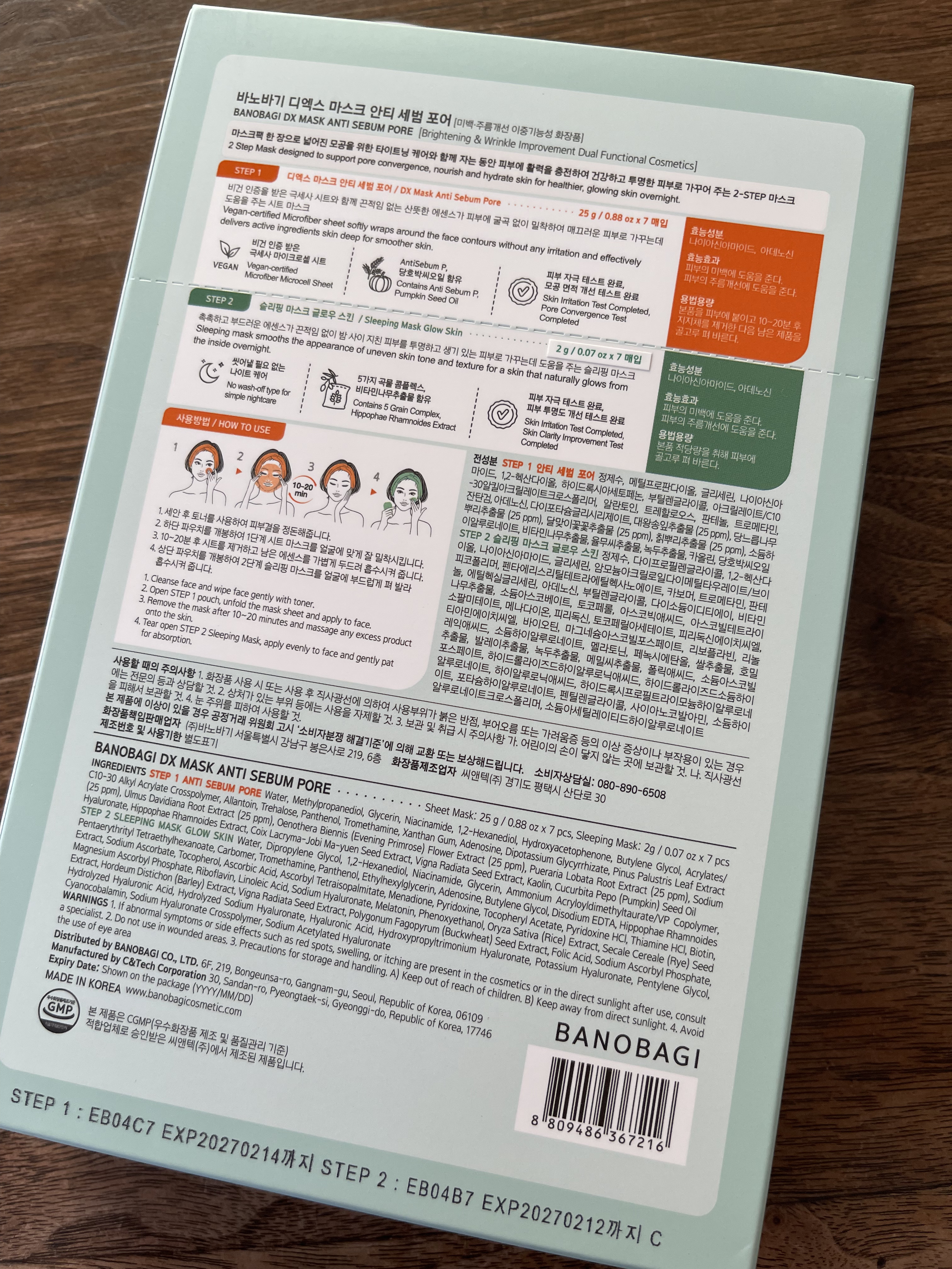 こちらはお肌のお悩み別で選べる2in1マスクになります。シートマスクと保湿クリームが1箱に7セット入っています。 DXマスク(シートマスク)を10から20分おいてパック次にスリーピングマスク(保湿クリーム)を顔全体に塗ったら洗い流さずにそのまま就寝します。 スリーピングマスクはプルプルしていて気持ちいい使い心地。夏に使いたくなる感触です。