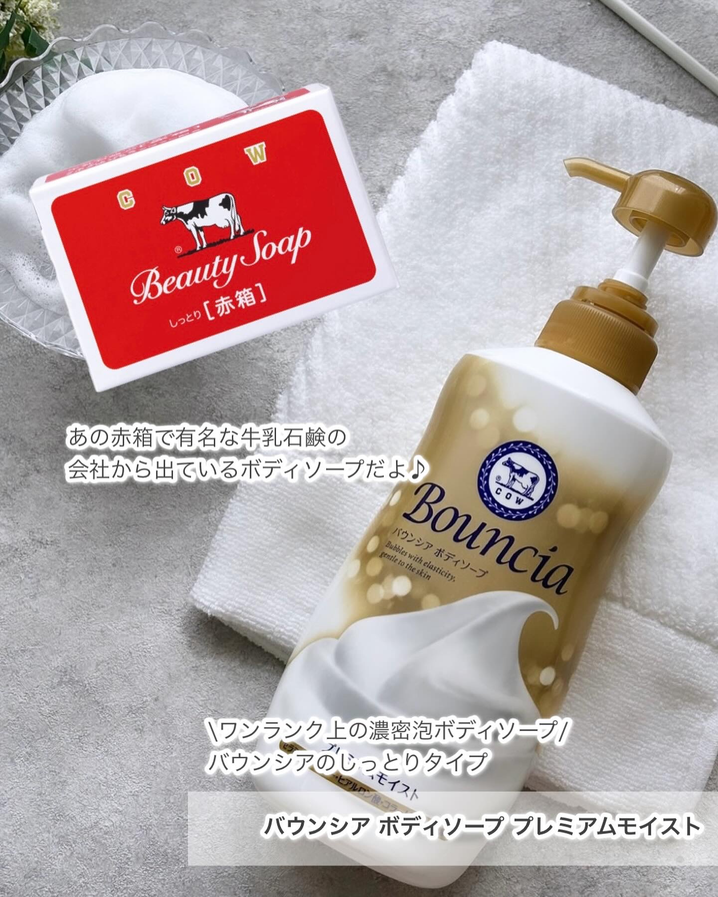 牛乳石鹸さまからいただきました🐄⸒⸒〖バウンシアボディソーププレミアムモイスト〗「バウンドするような泡」という意味がこめられた、牛乳石鹸のボディソープブランド“バウンシア”🤍1PUSHでしっかりと泡立ち、もっちり濃厚クリーム泡で摩擦レスで肌を...