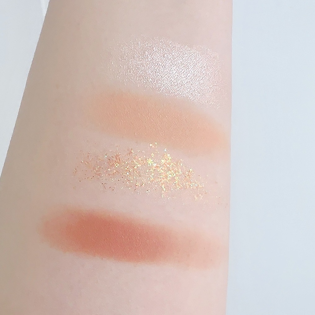 高発色だけどシアーで 粉質も柔らかく肌に密着してくれるアイシャドウ マットカラー2色、ハイライトカラー1色 グリッター1色、の4色パレット 個人的にやっぱり使いやすい04がお気に入り