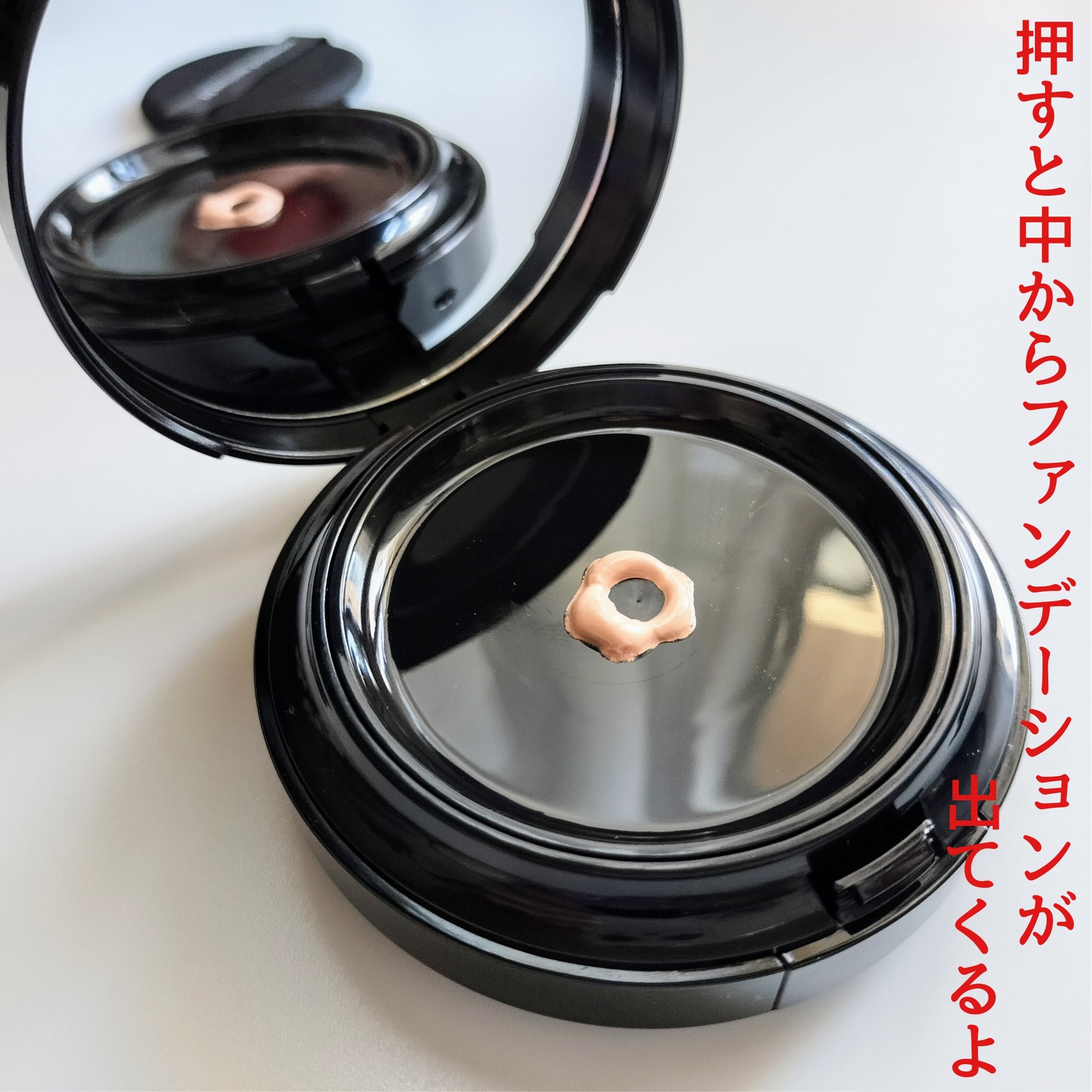 こちらはUVケアも◎ セッティングも簡単に装着できます😁 このブラック色したシンプルデザインの容器も素敵ですよね♡ パフにトントン馴染ませて肌にのせて みると少ししか取っていないのに、つきがよいですね。みずみずしいテクスチャです。 トントンなじませて伸ばしていくと 厚塗り感を感じさせない使用感です。 パフには、ほんの少しつけて内側から外にかけてポンポンと伸ばしていくのが ポイント。 つい、クッションファンデはたっぷりに なっちゃうけどほんの少しで良い◎ そうするとむらなく均一に肌にのせる ことができるね🥺
