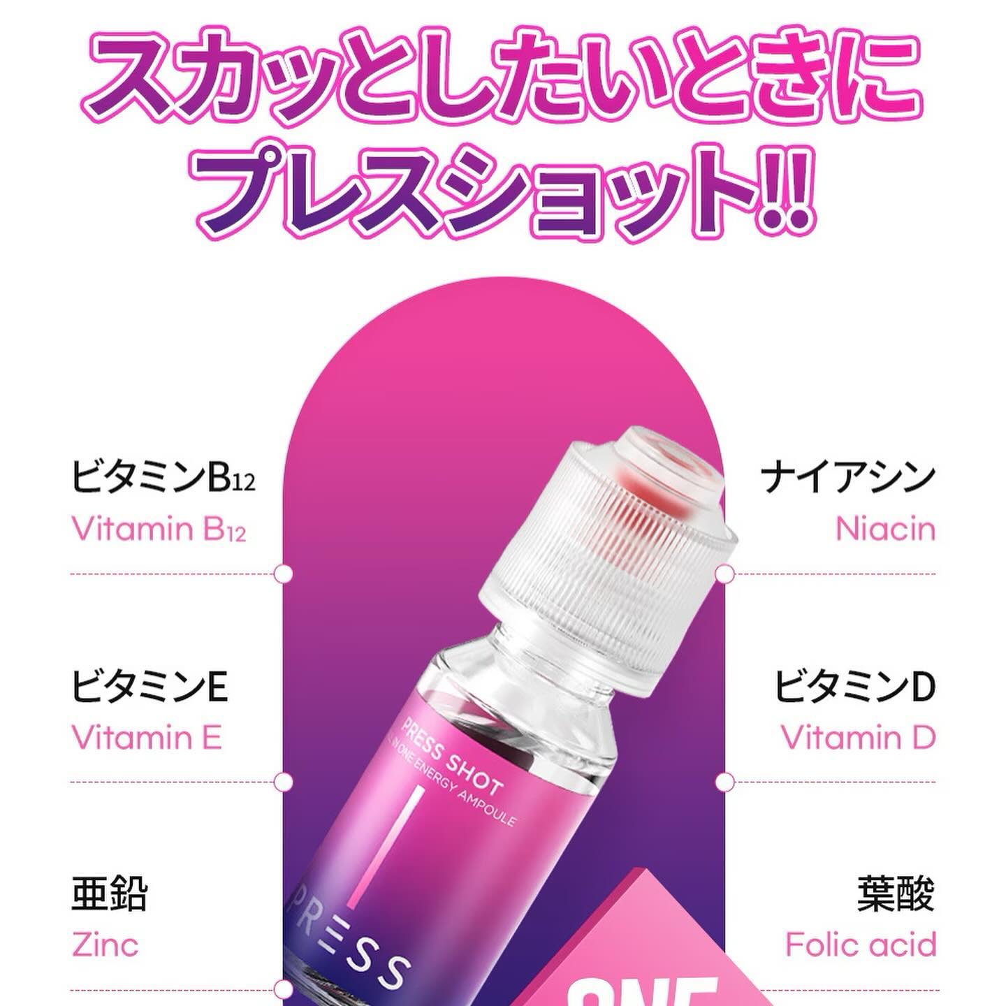 - ・PRESSしてSHAKEするだけ!魔法のようなピンクビタミンに! ・飲むインナービューティー ・飲むピンクビタミン ・粉末にはビタミン B12/D/E、葉酸、ナイアシン、亜鉛が含まれています ・吸収力を重視した液状タイプでの商品設計 ・特許取得の特殊キャップにビタミンを真空密封 ・ビタミンB群を集中配合 ・ビタミンB12は1日の基準値に対し16,667%配合 ・液体は11種類のアミノ酸で吸収しやすい設計 ・飲む瞬間にキャップを押す⇒ビタミンが液体に混ざりフレッシュなビタミンドリンクが完成! 【注意事項】 ・高カルシウム血症がある場合、または医薬品を服用されている方は専門家に相談してください。 ・体に異変を感じた場合は使用を中止し、速やかに専門家に相談してください。 ●本品は、多量摂取により疾病が治癒したり、より健康が増進するものではありません。 亜鉛の摂り過ぎは、銅の吸収を阻害するおそれがありますので、過剰摂取にならないよう注意してください。一日の摂取目安量を守ってください。乳幼児・小児は本品の摂取を避けてください。 ●本品は、特定保健用食品と異なり、消費者庁長官による個別審査を受けたものではありません。 ●食生活は、主食、主菜、副菜を基本に、食事のバランスを。 ●本品製造工場では卵、小麦、そば、落花生、えび、かに、くるみを含む製品を製造しています。 ●摂取目安量:1日当たり1本を目安にお飲みください。 ●摂取の方法:キャップを押すと粉末が落ちます。上下に振り、混ぜてからお飲みください。※粉末が固まる場合がございますが、品質には問題ありません。よく振ってからお飲みください。 2024年12月中旬より全国のウエルシア薬局とロフト※にて先行販売をいたします。 ※一部お取り扱いがない店舗がございます。