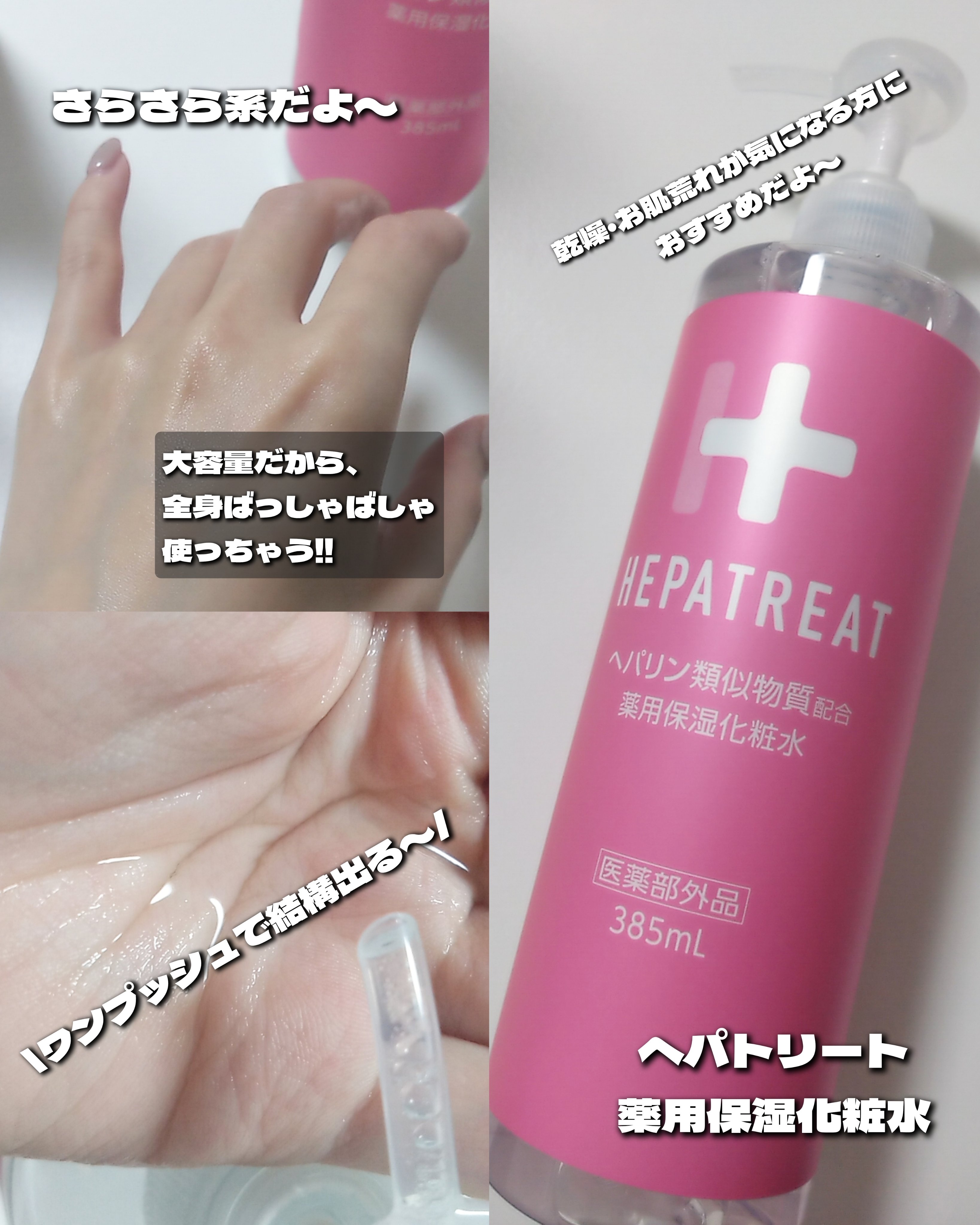 - ヘパトリートは保水有効成分のヘパリン類似物質と肌あれ有効成分のグリチルリチン酸ジカリウムを配合し、8つのフリーを実現。低刺激処方ながら高機能な化粧水です。さらに、薬用化粧水では珍しい大容量ポンプ(385mL)でとても使いやすく、赤ちゃんから大人まで、顔や全身の肌あれ・乾燥に使えます。 ■Wの有効成分 1.ヘパリン類似物質 顔・全身の乾燥を防ぐ 肌の乾燥による肌あれ/あれ性/皮膚を健やかに保つ/肌を整える/あせも/ひび/あかぎれ 2.グリチルリチン酸ジカリウム ニキビを防ぐ/肌をひきしめる/日やけ、雪やけ後のほてりを防ぐ/しもやけ/かみそりまけを防ぐ ■肌にやさしい低刺激処方<8つのフリー> 無香料/無着色/無鉱物油/無動物油/パラベンフリー/アルコールフリー/石油系界面活性剤フリー/シリコンフリー ※パッチテスト済み ※スティンギングテスト済み