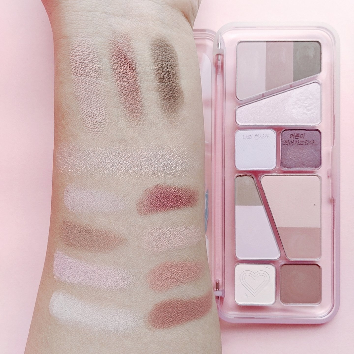 プチプラのクオリティじゃないっ!! 発売前からチェックしていたけれど、ここまで可愛いとは…😆 絶妙カラーで目もとのくすみを飛ばして*明るい印象に🩷 横割りグラデーションでメイクし、立体感をより出したかったので最後に1番左のカラーを上まぶたの真ん中と涙袋にのせています🙆 肌馴染みも良くて粉飛びも感じにくかったです💕 ブラウンの方も店頭に出てたら買おうかな💓