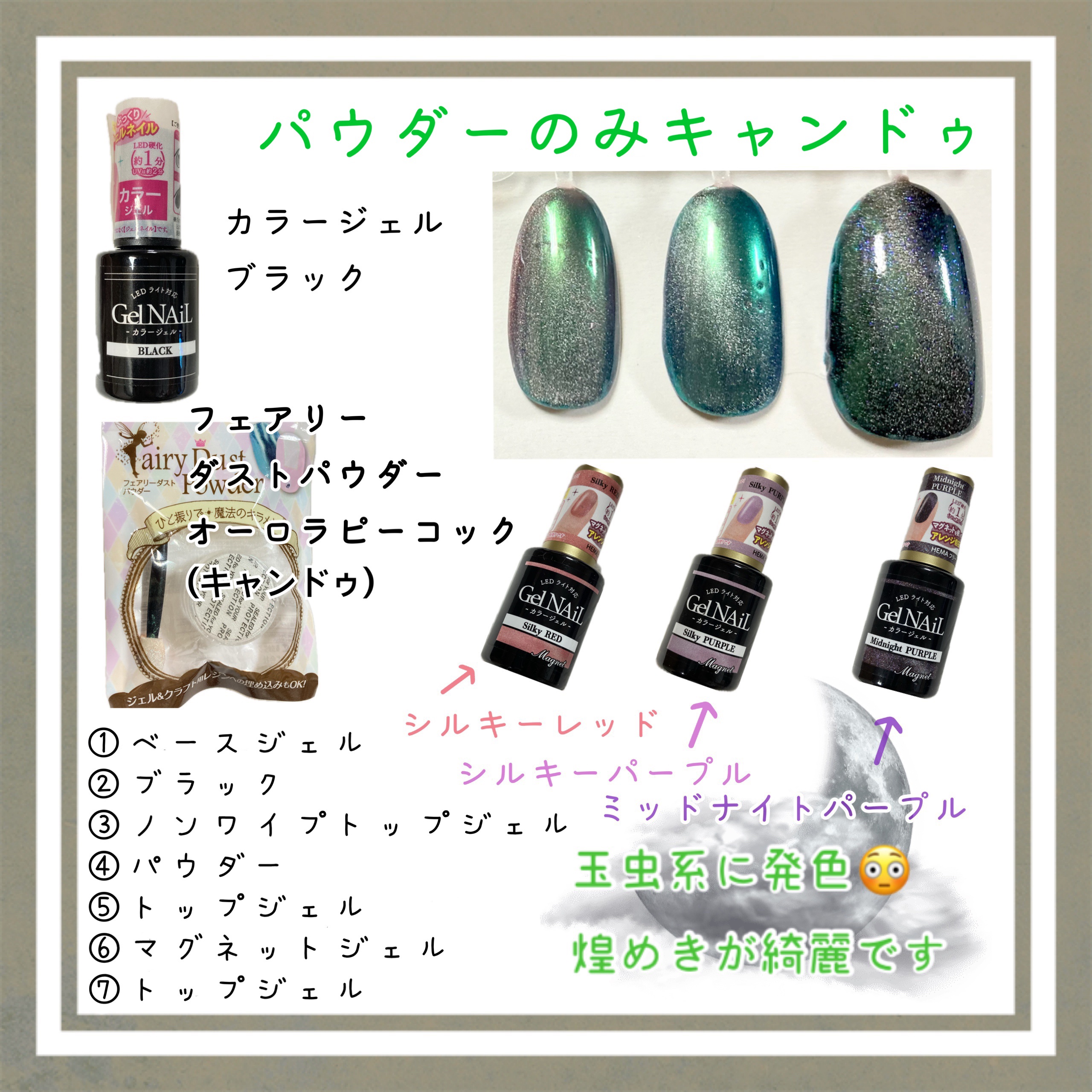 オーロラネイル簡単で、初心者さんにもオススメです✨ パーツはクリアだと、トップジェルのムラが目立ちやすい気がして、キラキラのビジューの方が仕上がりが綺麗な気がしました🤩 DAISO BRG ジェルネイル(ホワイト)¥110 DAISOミラーネイルパウダー¥110