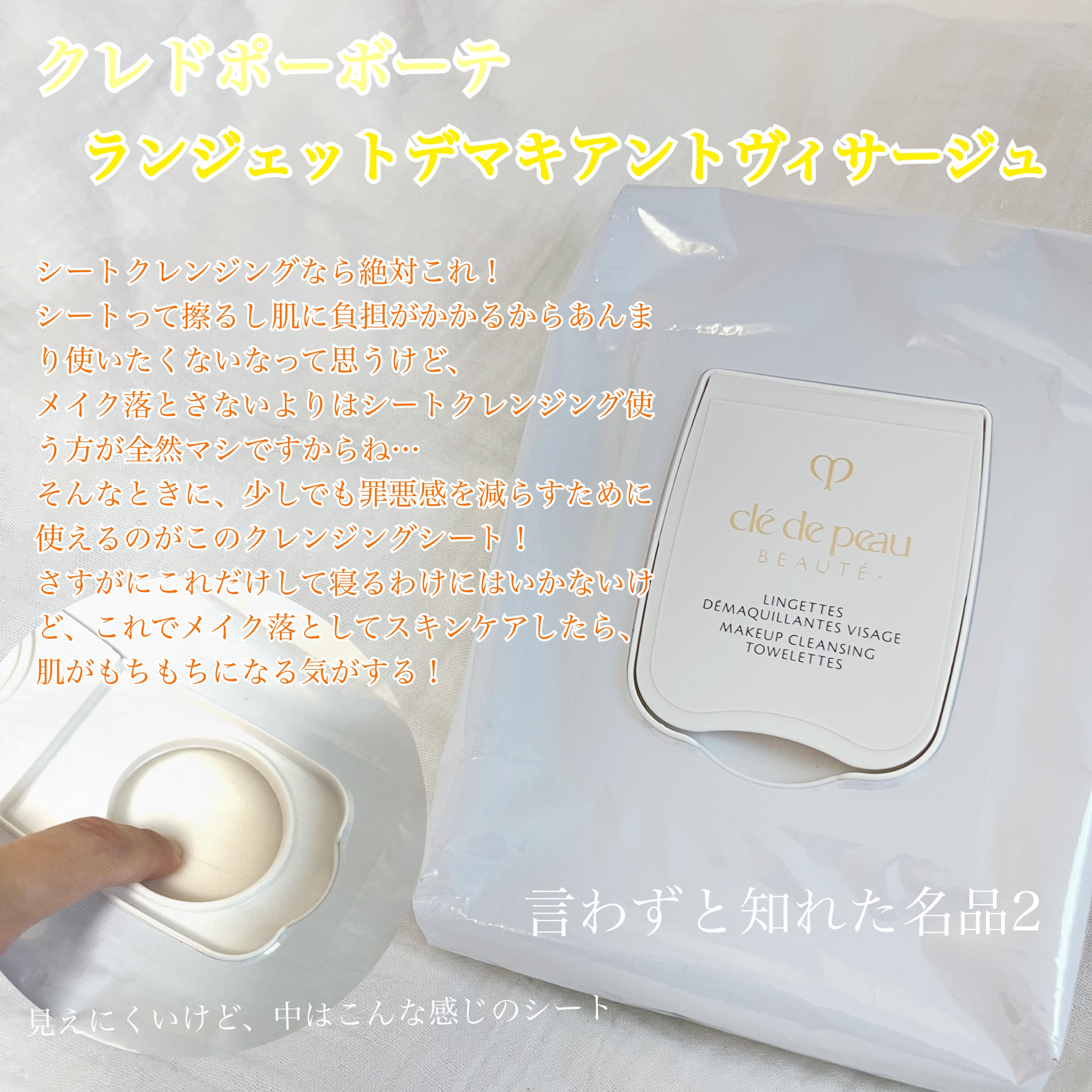 拭き取りクレンジングで美肌ケアまで出来ちゃう紙アイテム! クレ・ド・ポー ボーテ ランジェット デマキアントヴィサージュは、一時期SNSでもバズった、超ファビュラスな拭き取りタイプのクレンジング。 優しく撫でるように拭き取るだけで、アイメイクやファンデーションもしっかり落ちてくれます🙆♀️ 拭き取り系にありがちな肌への負担や、乾燥した感じが一切なくて 角質ケアをした後にいい美容液を仕込んだ後のようなつるんとしっとり潤った肌になるの🥹✨✨✨
