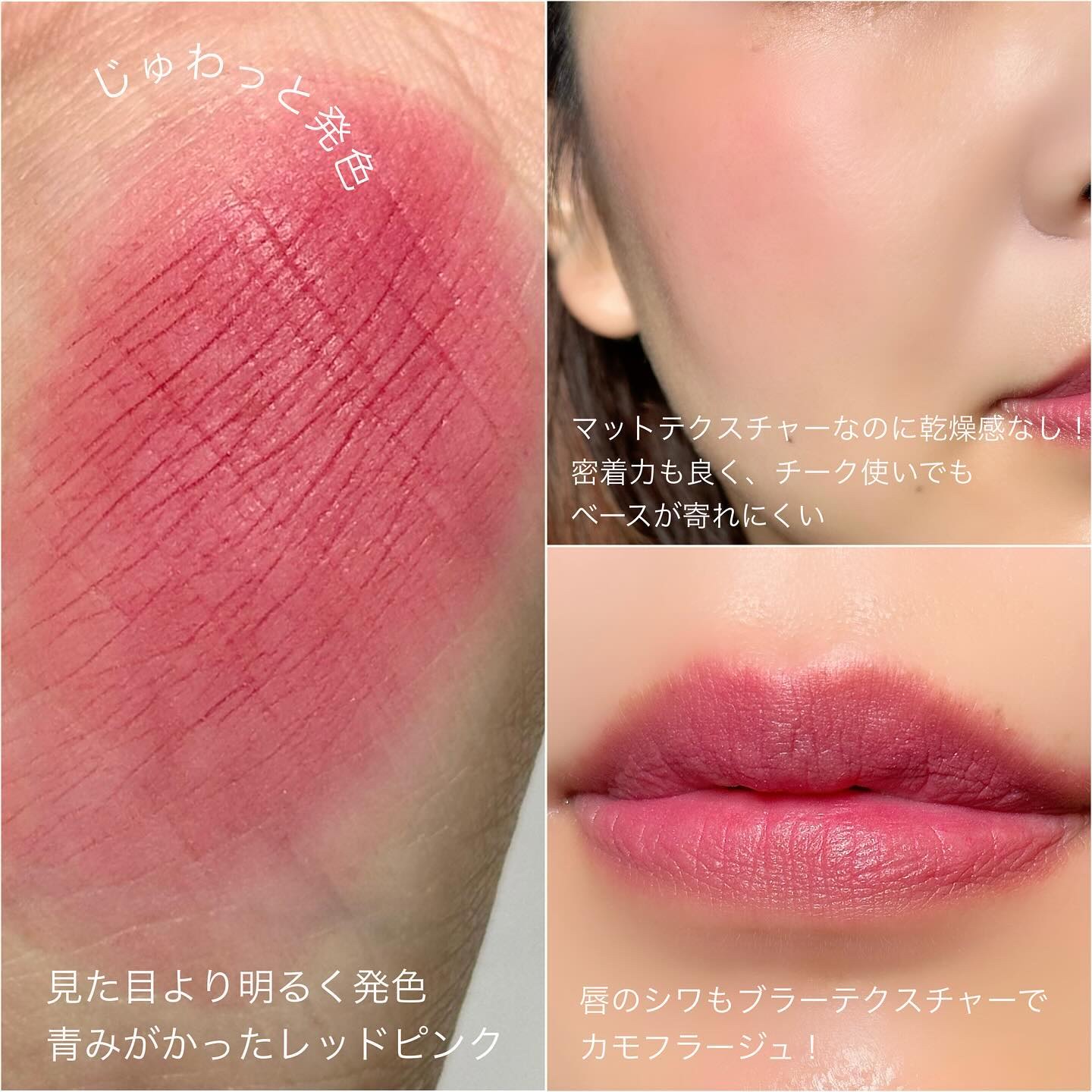 質感は触るとむにっとしていて肌に乗せるとふわっと簡単にぼけてくれます。 密着力も良い方かなと思いますがティッシュでしっかり擦れば綺麗に落ちました。 カラー展開がすごく豊富なのが特徴。6つのカラーモーメントに分けられていてなんと全30色展開…!すごい!! 質感はふんわりととっても可愛いのでマットのリップ&チークをお探しの方はよかったら手に取ってみてください…!