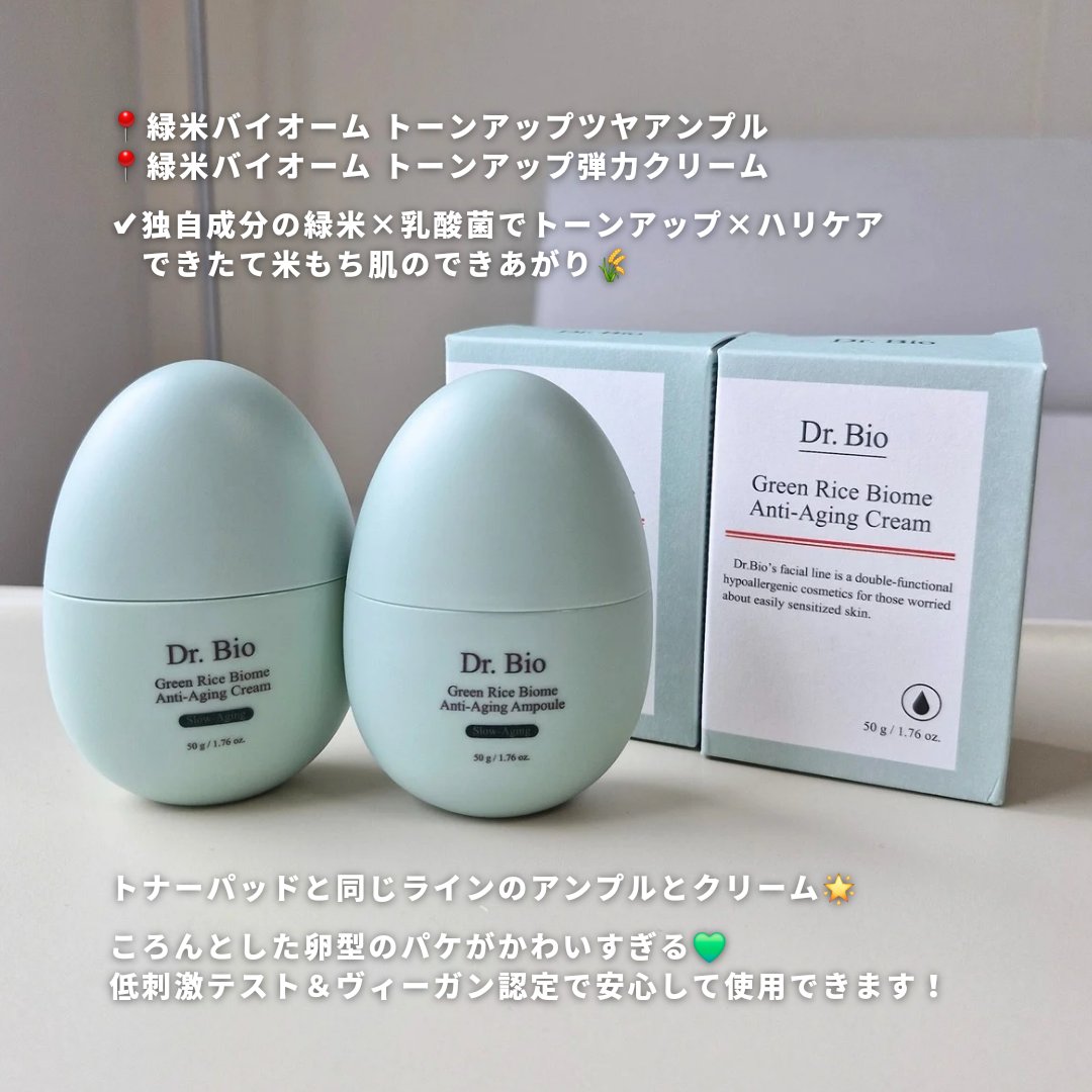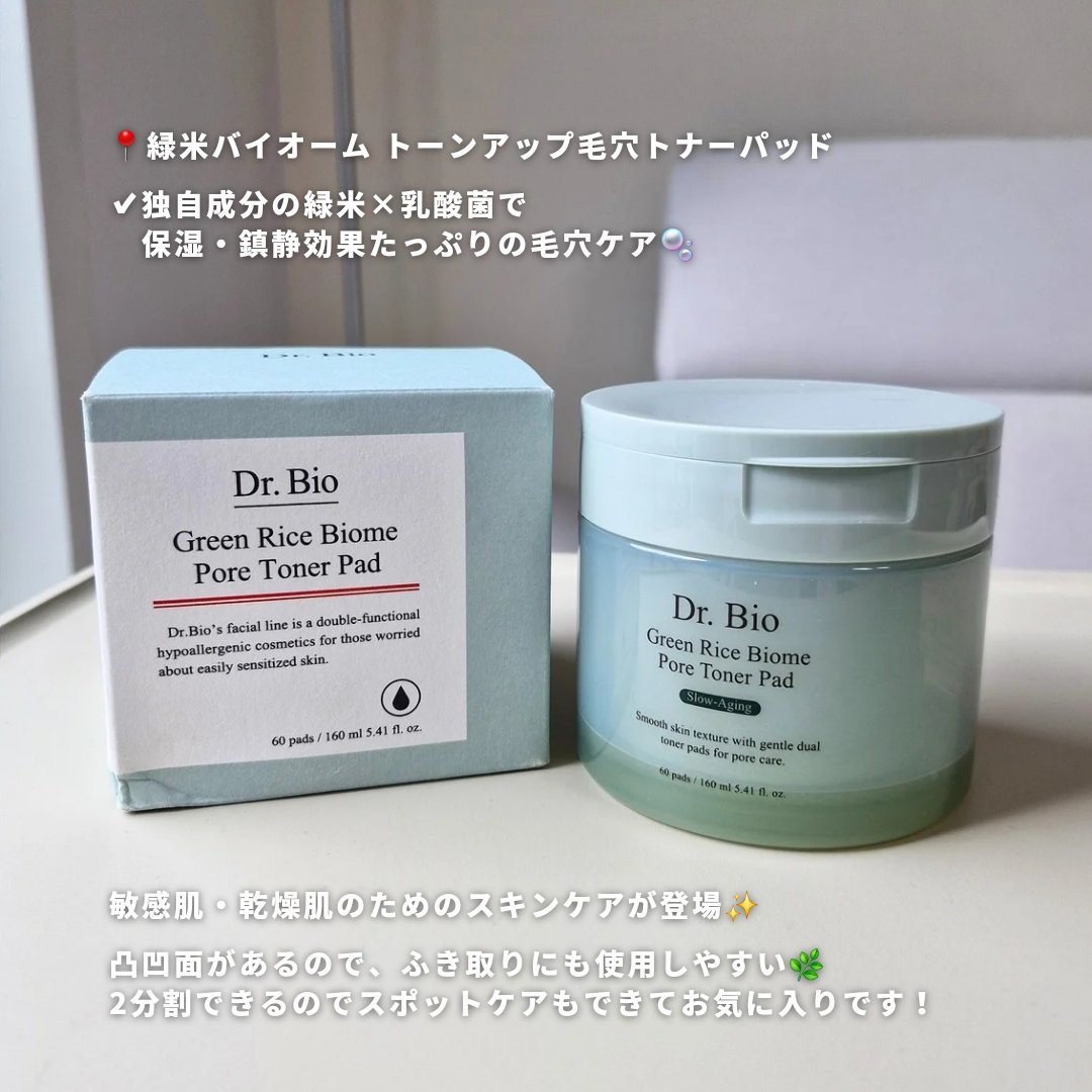 敏感肌でも安心して使えるアイテムたち🥰 緑米バイオーム™トーンアップスキンケアシリーズは「古代米」と呼ばれる緑米エキスと、Dr.Bio独自のプロバイオティクス成分のPREBIOME™配合の新感覚トーンアップスキンケアライン! 毛穴・弾力・保湿までオールインワンケアできるパッド🎶 リオセル面はガーゼのような触り心地で角質ケアに◎ 保湿やトーンアップ、お肌の保護までこれ1本! メイク前にこれを仕込むことで、ツヤ肌完成🥰