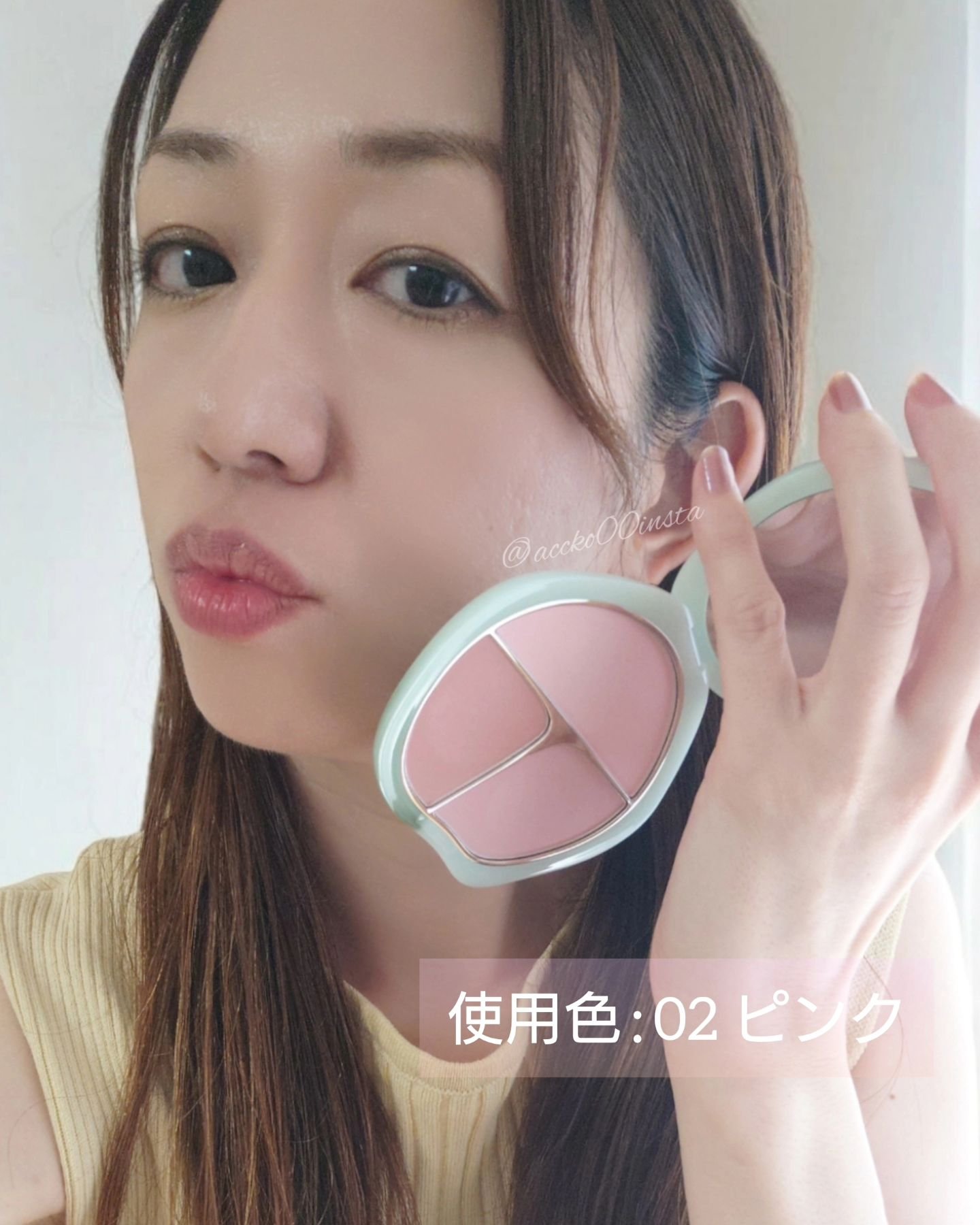 - 「膨張色+メインカラー+収縮色」の三色一体型チークパレット。 異なる明度と彩度の色で自然なグラデーションと立体感を作ることが可能。単色で使用すれば様々な雰囲気のメイクが楽しめ、違う色を重ねて使用すると、三色が程よいバランスで雰囲気と立体感を作り出す。