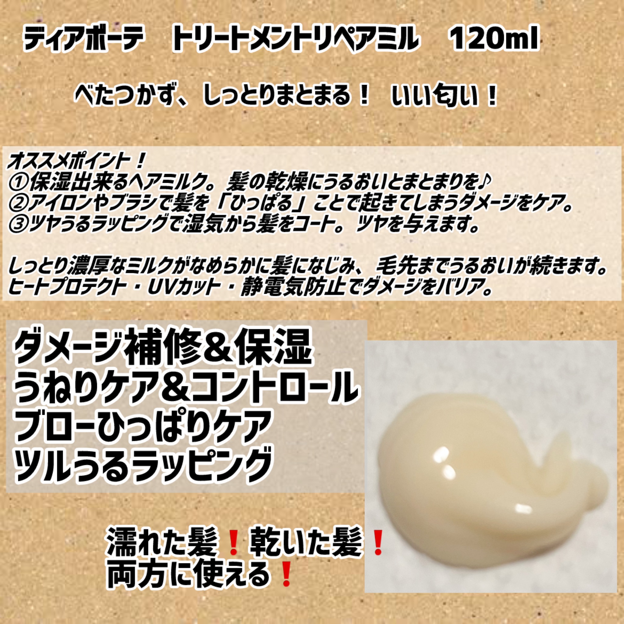ディアボーテトリートメントリペアミルク120ml¥1,045LIPSショッピング購入品🛍️ヘアミルクが髪にいいとのことで気になって購入してみました!まとまりがよくなってよかったです✨✨...