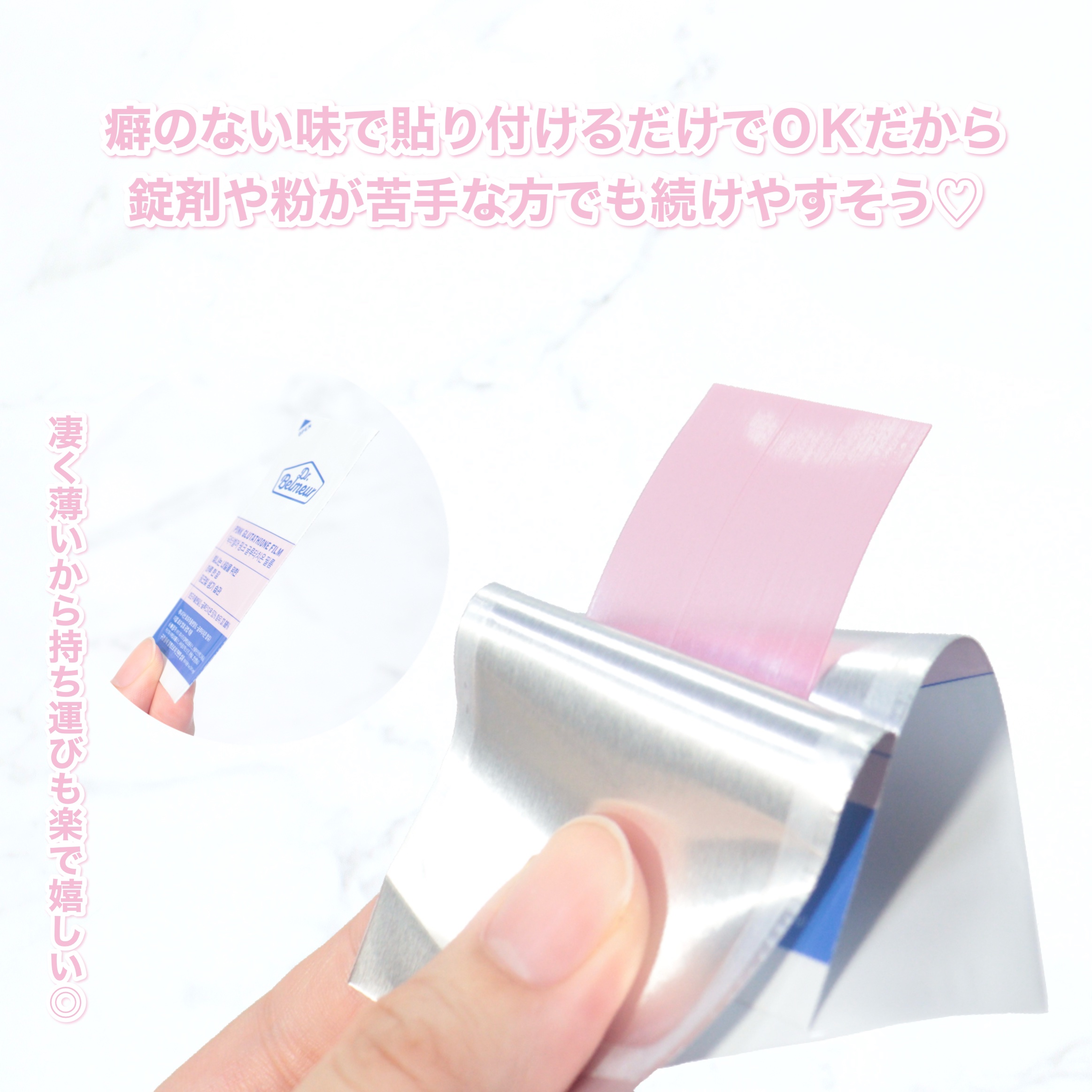 話題のインナービューティー食品、Dr.belmeurのピンクGLTフィルムを使用してみたよ💗 グローバル原料会社NUTRALabのカナダ産酵母エキスパウダー130mf配合しているんだって👀 持ち運びやすい薄型のフィルムタイプだから、ポーチにもすっぽり!